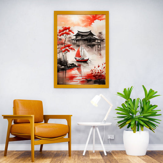 Red Boat Sunset Asian Style Poster | Wall Art for Home & Office | High-Quality Print