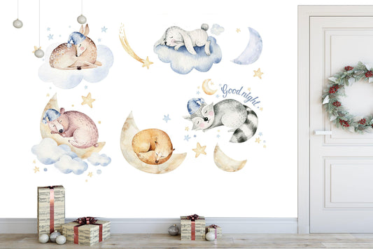 Forest animals Nursery wall decal, Watercolor animal wall stickers, Clouds wall decal, Moon wall sticker, Baby Gender Neutral Wall artDecor