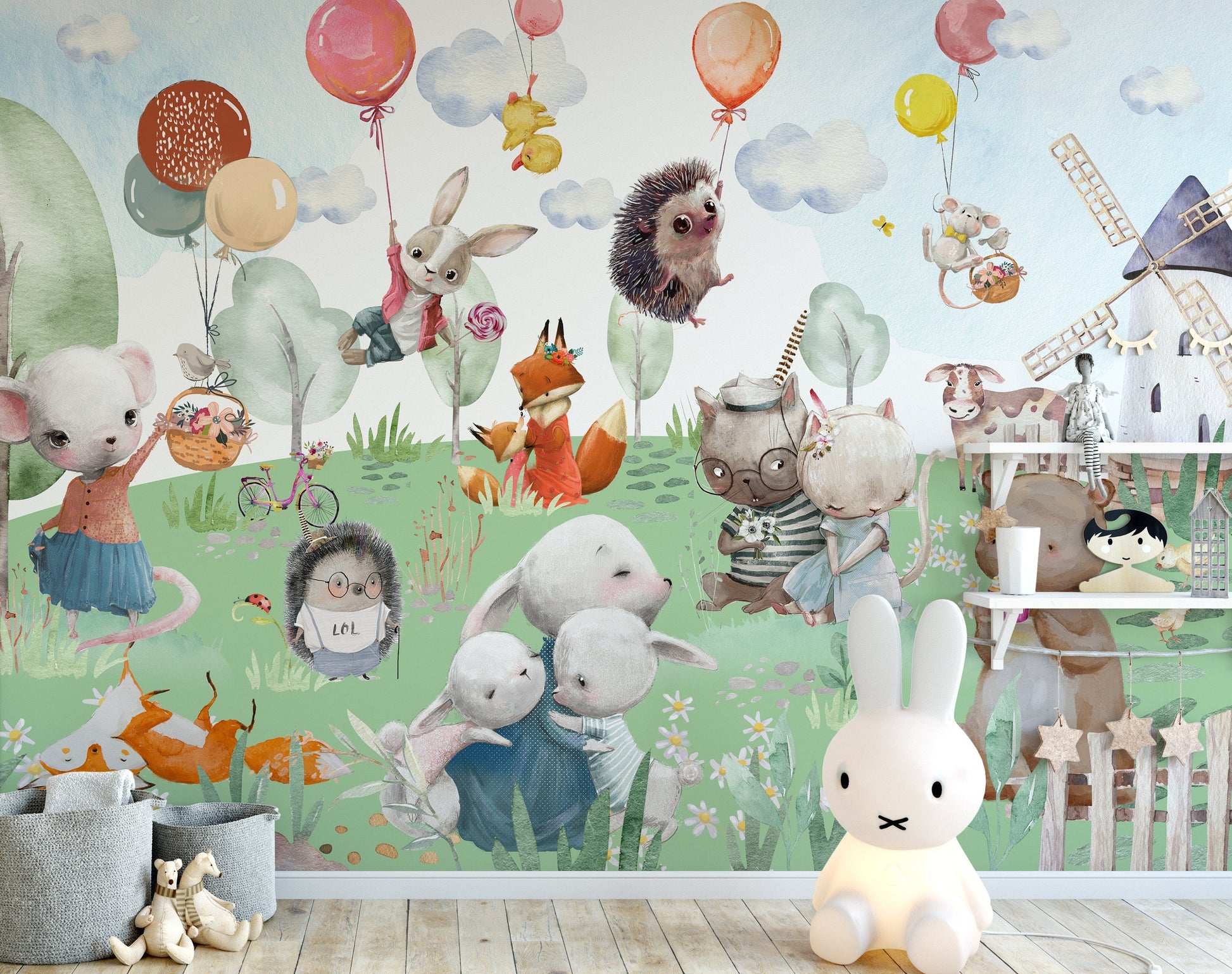 Introducing our charming and playful Full Wall Muriel Wallpaper, perfect for adding a touch of whimsy to any children's bedroom! This delightful wallpaper features a fun and colorful cartoon design, complete with multiple cute animals and a windmill. The animals include rabbits, mice, hedgehogs, bears, and more, all frolicking in a whimsical landscape of clouds and grass.