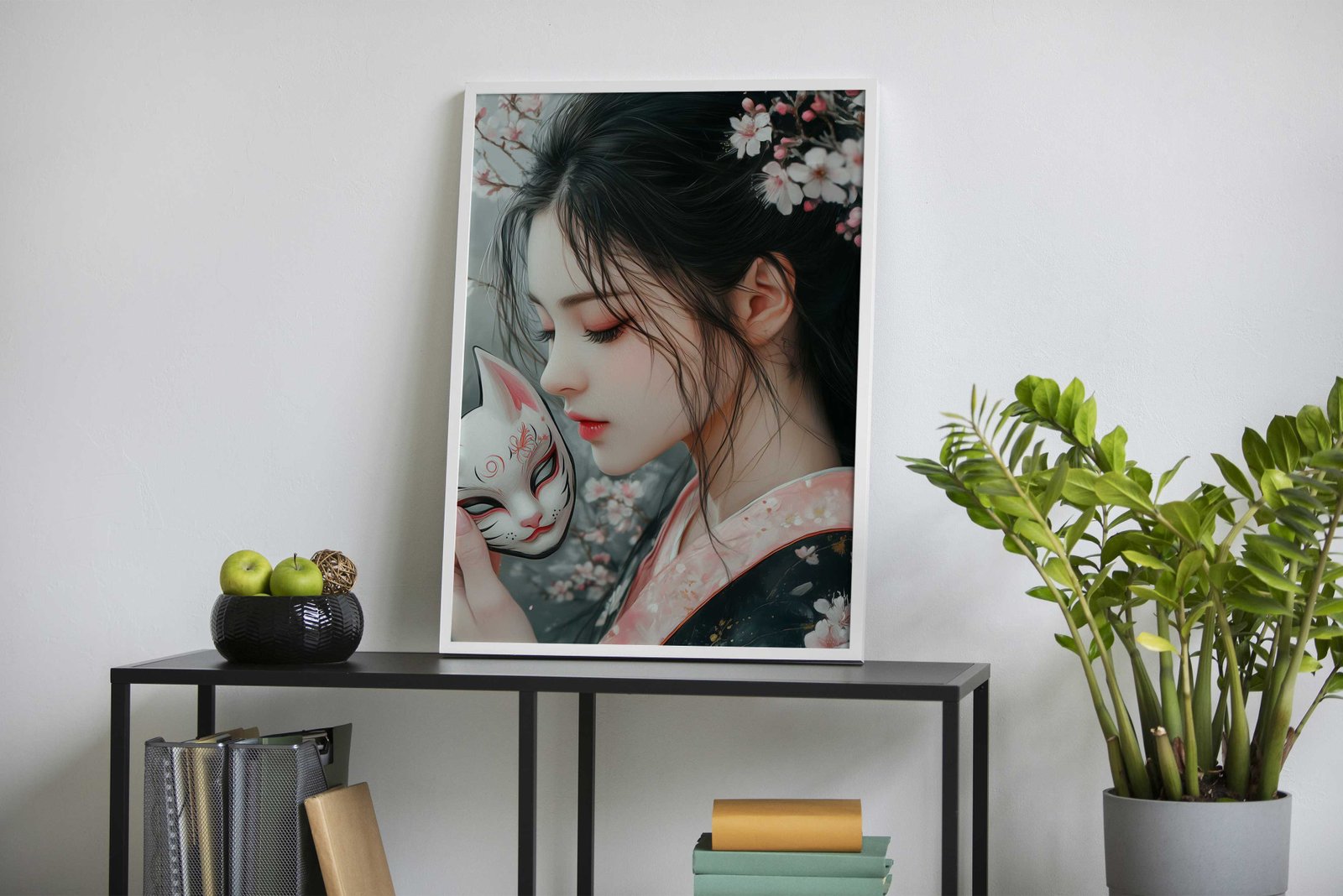 Asian Girl with Kitsune Mask & Cherry Blossoms Asian Style Poster | Wall Art for Home & Office | High-Quality Print