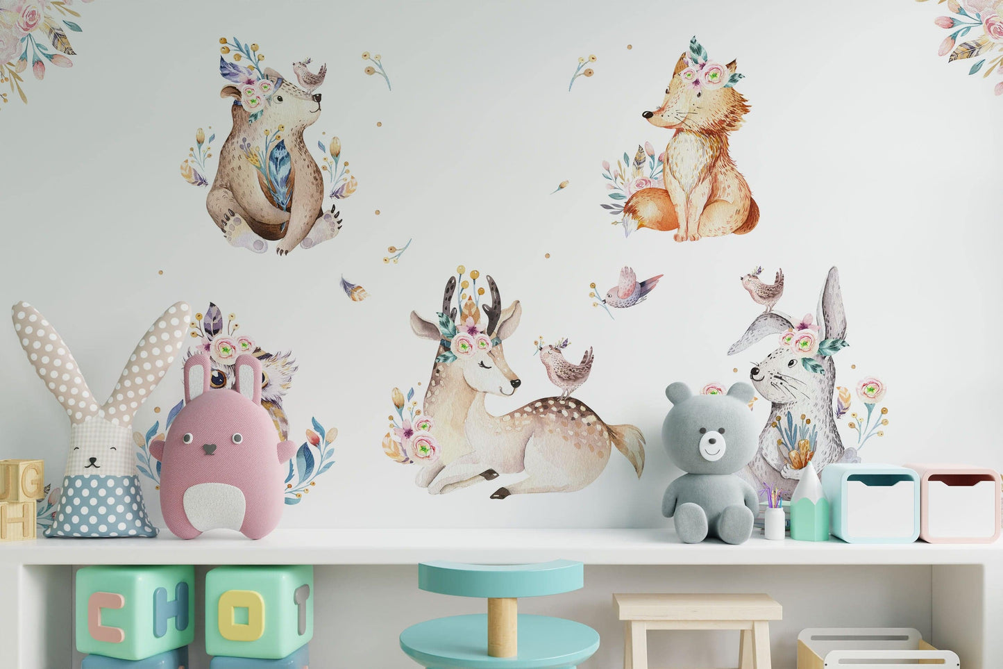 Transform your child's room into a whimsical woodland retreat with our Backwoods Wall Decal Set! Featuring beautifully designed forest animals, trees, and nature elements in stunning watercolor style, this large decal set is perfect for creating a cozy, nature-inspired nursery or playroom. Each piece is separated on the material, allowing you to arrange the decals in your own unique way.