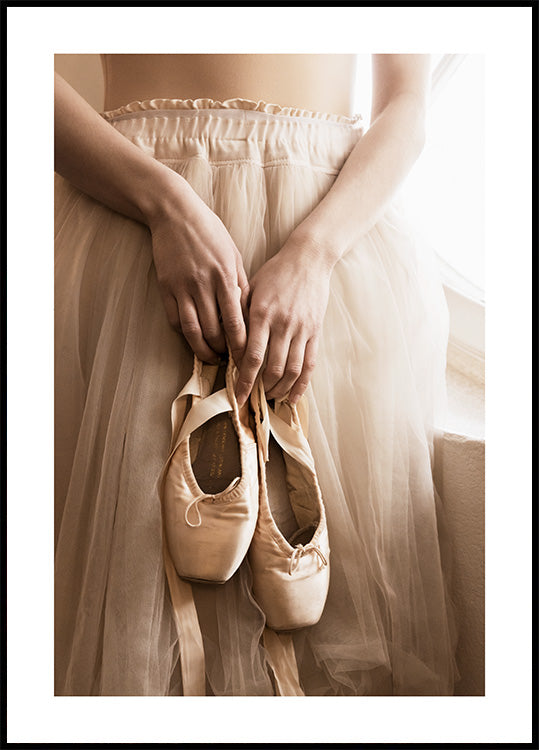 Add a touch of elegance and grace to your decor with our Ballerina Beige Poster. This enchanting photograph captures a ballerina in a soft tulle skirt, holding her ballet shoes, with gentle pink and beige tones that evoke a romantic, dreamlike atmosphere. The grainy texture of the image adds a nostalgic feel, making it a beautiful addition to any space looking for a soft, artistic touch.