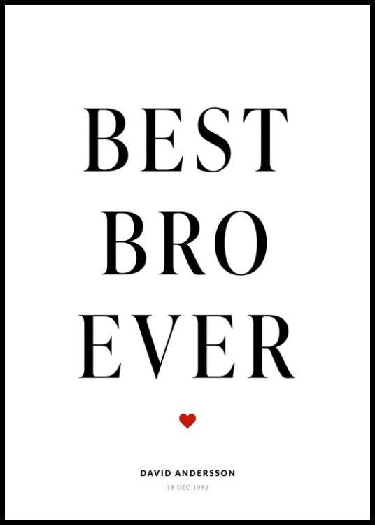 Celebrate the bond between you and your brother with the "Best Bro Ever" Personal Poster. This stylish and heartfelt print features the bold message "Best Bro Ever" accompanied by a heart, and allows you to personalize the text underneath, making it a truly unique and thoughtful gift. Perfect for adding a personal touch to any room, this poster is a great way to show your appreciation and love for your sibling. Whether it's for a birthday, special occasion, or just because, it’s a meaningful gift that will be cherished for years to come.