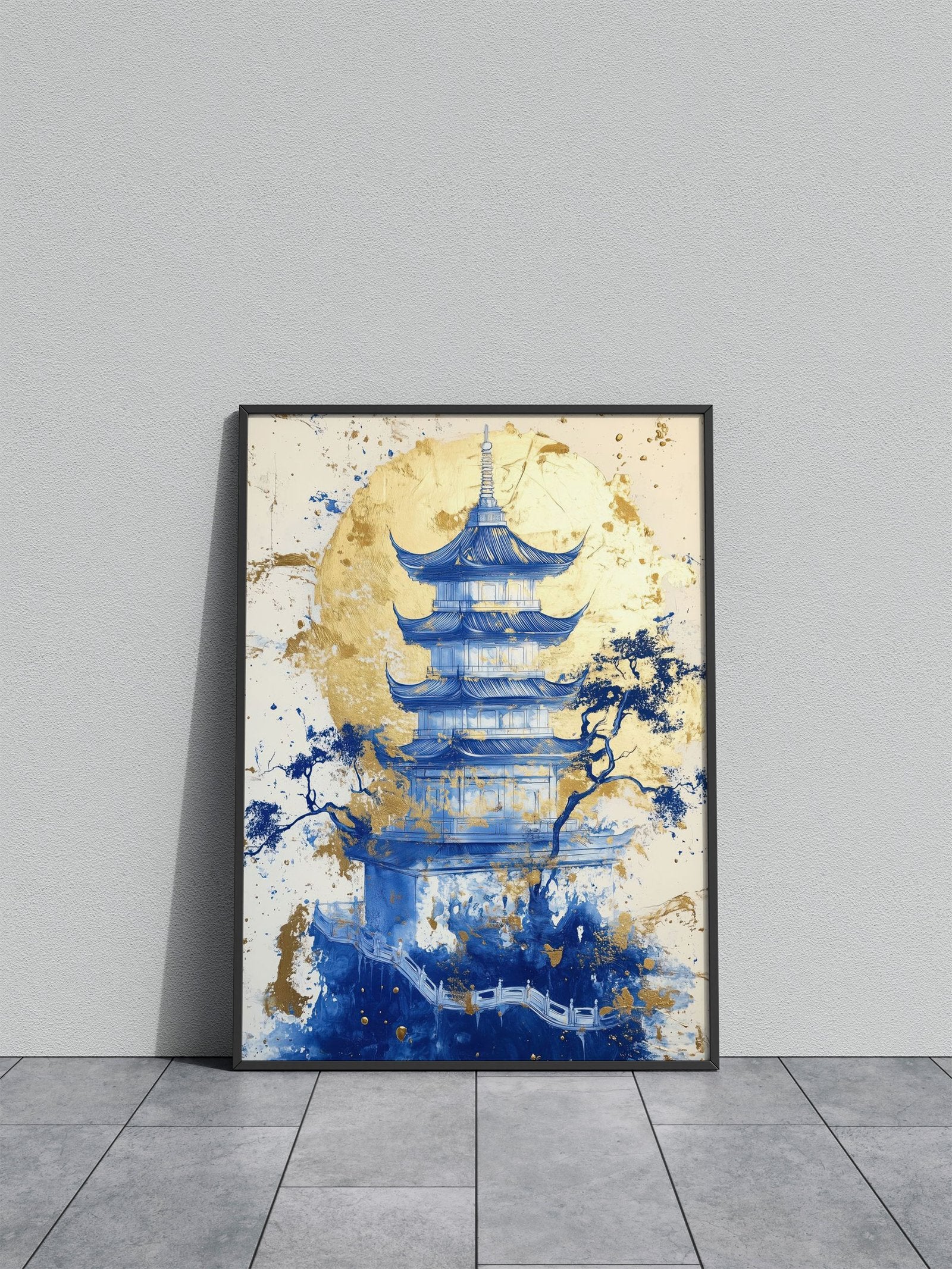 Blue and Gold Pagoda Asian Style Poster | Wall Art for Home & Office | High-Quality Print