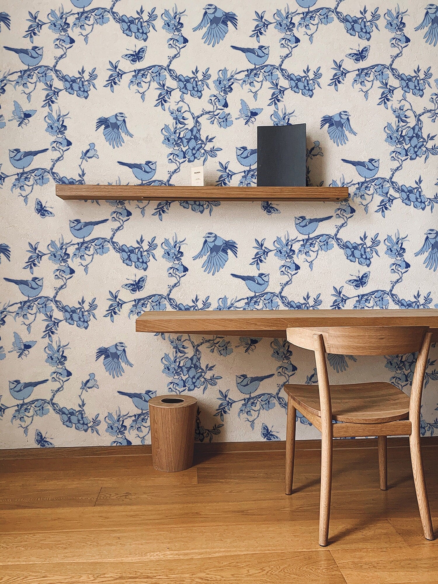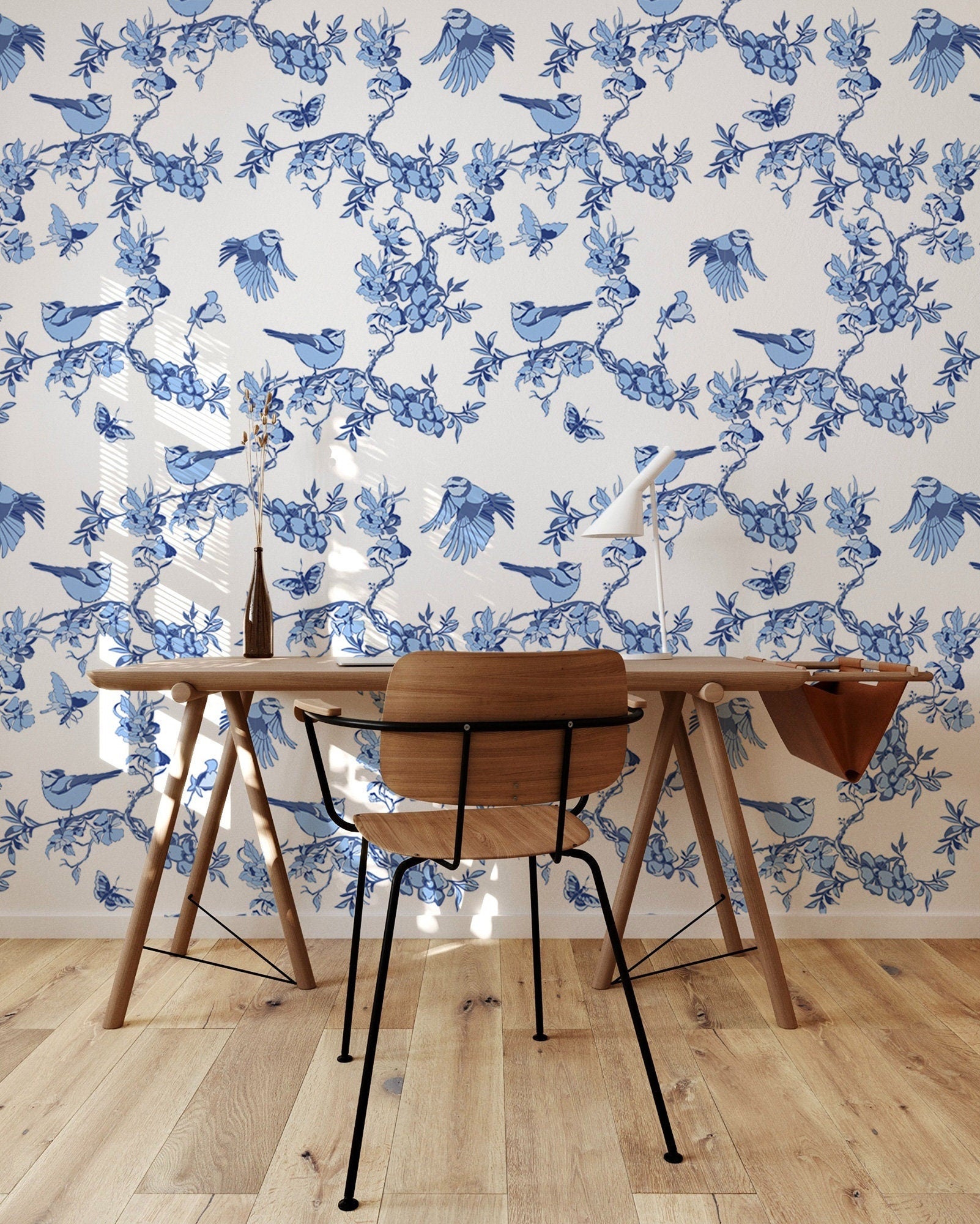 Blue Birds And Flowers Wallpaper, Wall Mural, Peel and Stick, Self Adhesive, Wall Covering by Bella Stampa Studio