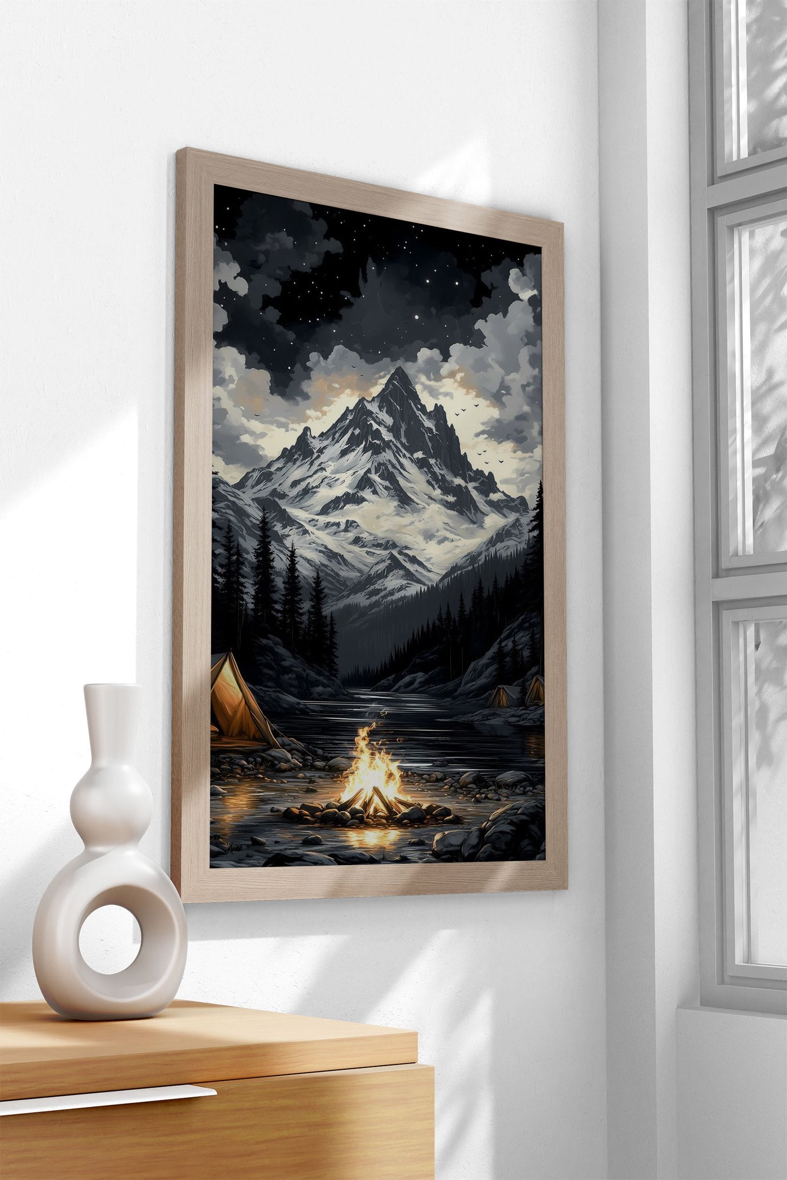 Campfire Under Snowy Peak Asian Style Poster | Wall Art for Home & Office | High-Quality Print