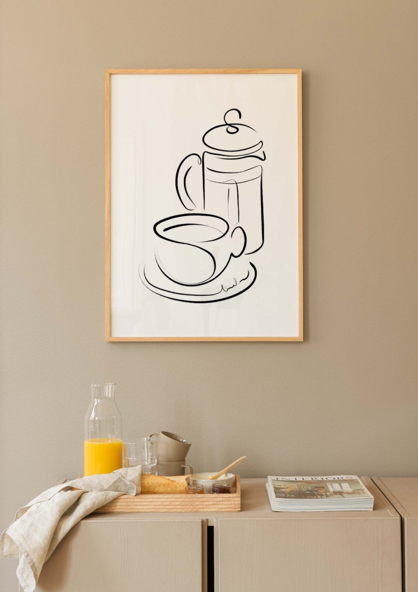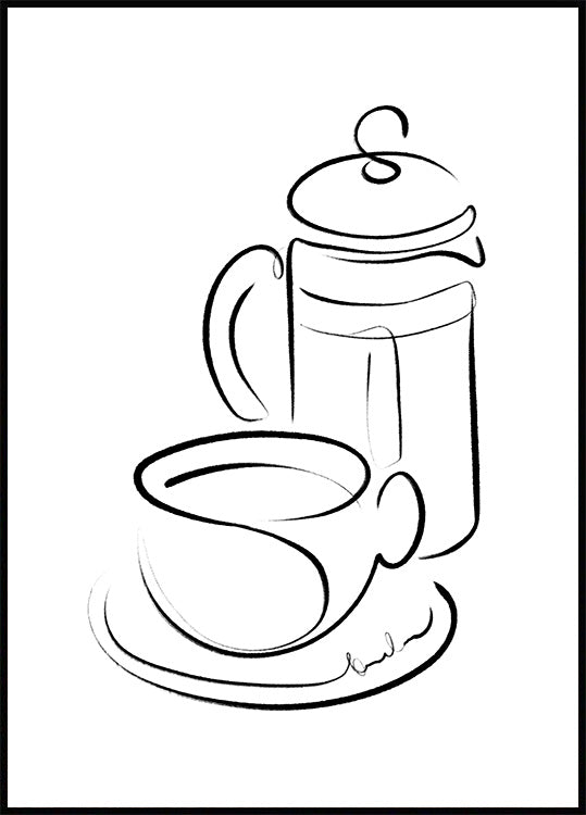 Line art print of a coffee press and a coffee cup in black and white. Create a stylish and simple kitchen wall art with this minimalist print. Combine this poster along with other kitchen prints and quotes.