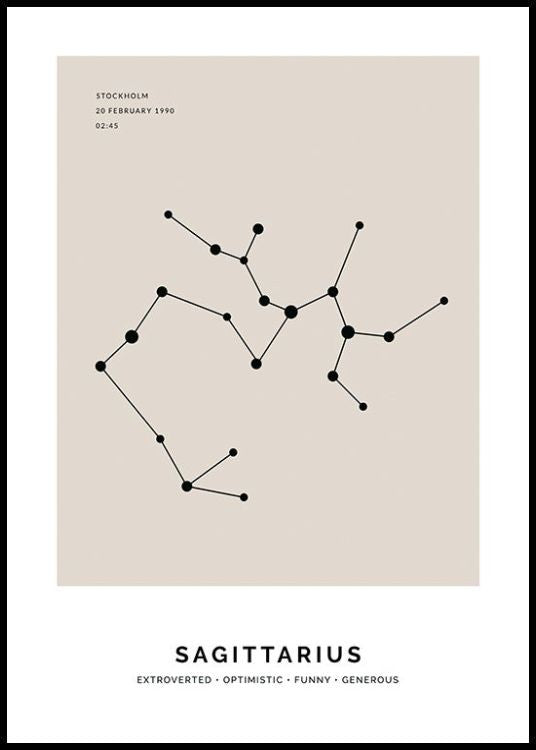 - Illustration of a Sagittarius zodiac sign in black on a beige background Illustration of the Sagittarius zodiac sign in black on a beige background with text in the top left corner and underneath the image. Personalised prints allow you to customise your own print and make it unique! The poster is printed with a white margin around the image. Please note that it is not possible to return a personalised poster.