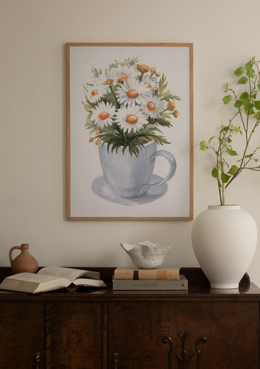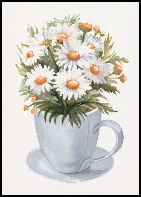 Daisies in a teacup. A print showing a flowers planted in a cup - a beautiful choice for springtime! This motif is originally hand-painted.
