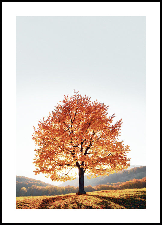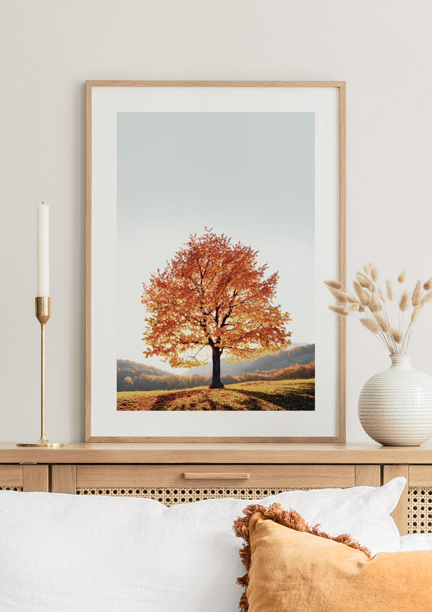 Photograph of a dramatic orange tree in the meadow inspired by the autumn. A close-to-nature print that will create depth in your home decor! The poster has a printed white margin that frames the design.