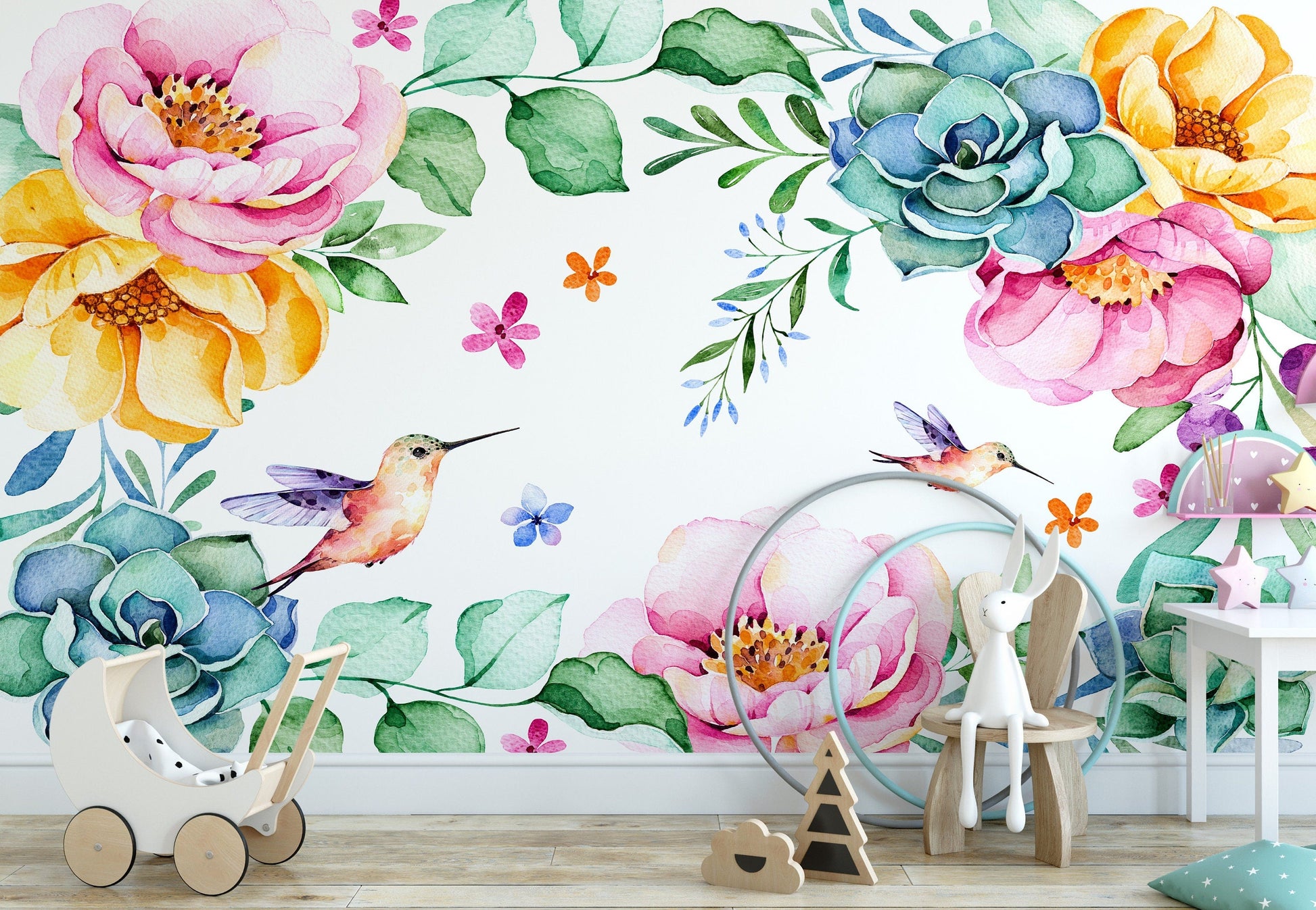 Vibrant Flowers wallpaper featuring beautiful watercolour spring and meadow flowers is the perfect addition to a nursery, girl's bedroom. Vibrant colours would be a fantastic base for any furniture in the room and would create a lovely feature wall!
