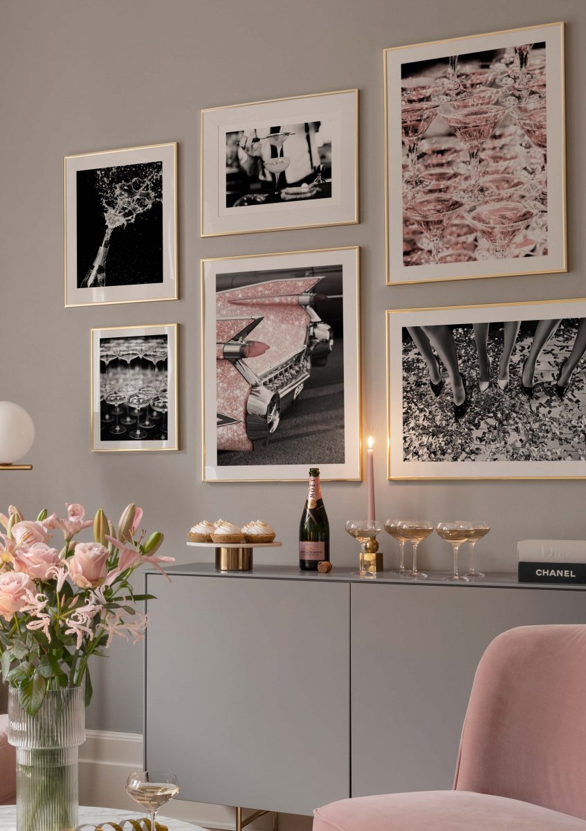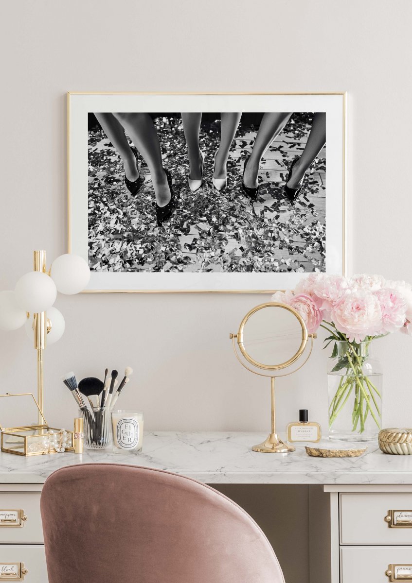 A monochrome photograph of girls celebrate in high heels and a lot of confetti on the floor. This print is perfect for you that is looking for a girly and cool vibe in your home decor The poster has a printed white margin that frames the design.