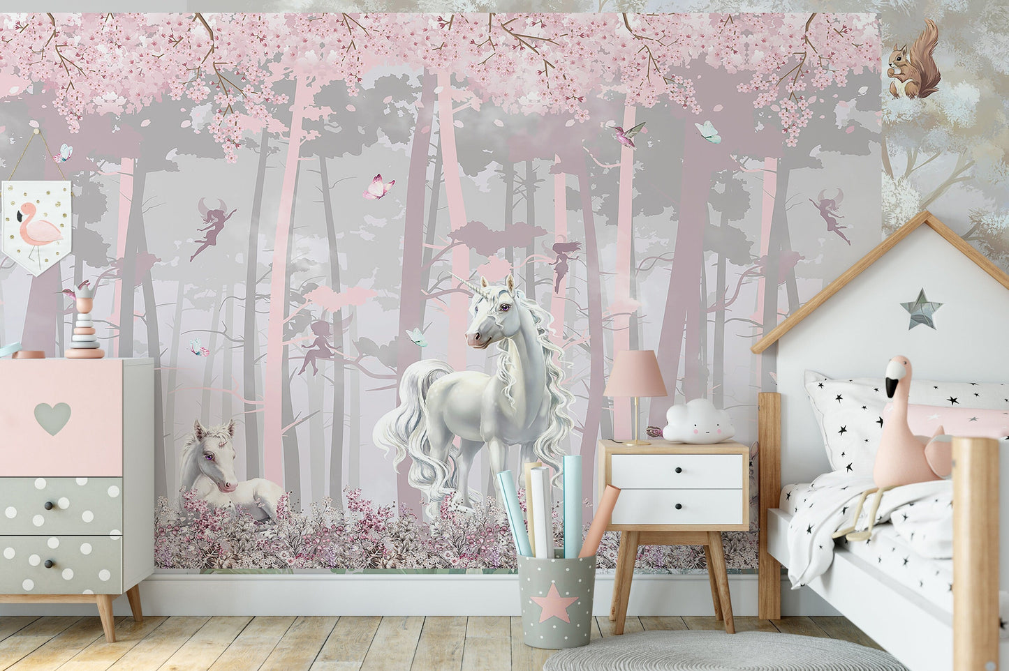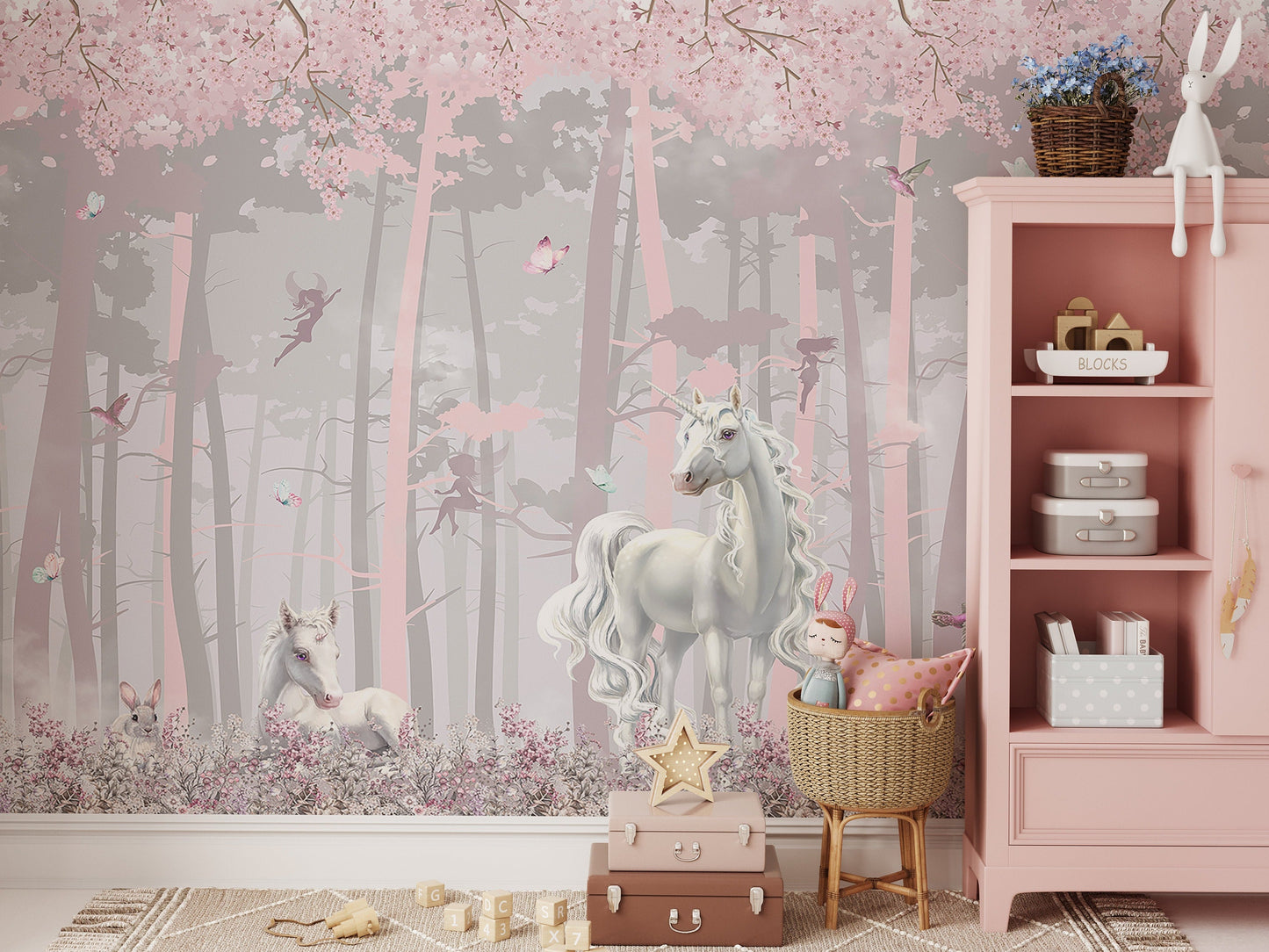 Crafted with great attention to detail, the intricate design of the unicorns' manes and tails, the fairy wings, and the rabbit ears and noses will captivate your child's imagination and transport them to a world of wonder and fantasy. The soft pink and grey color palette creates a calming and soothing atmosphere, making it the ideal backdrop for your child's dreams and adventures.