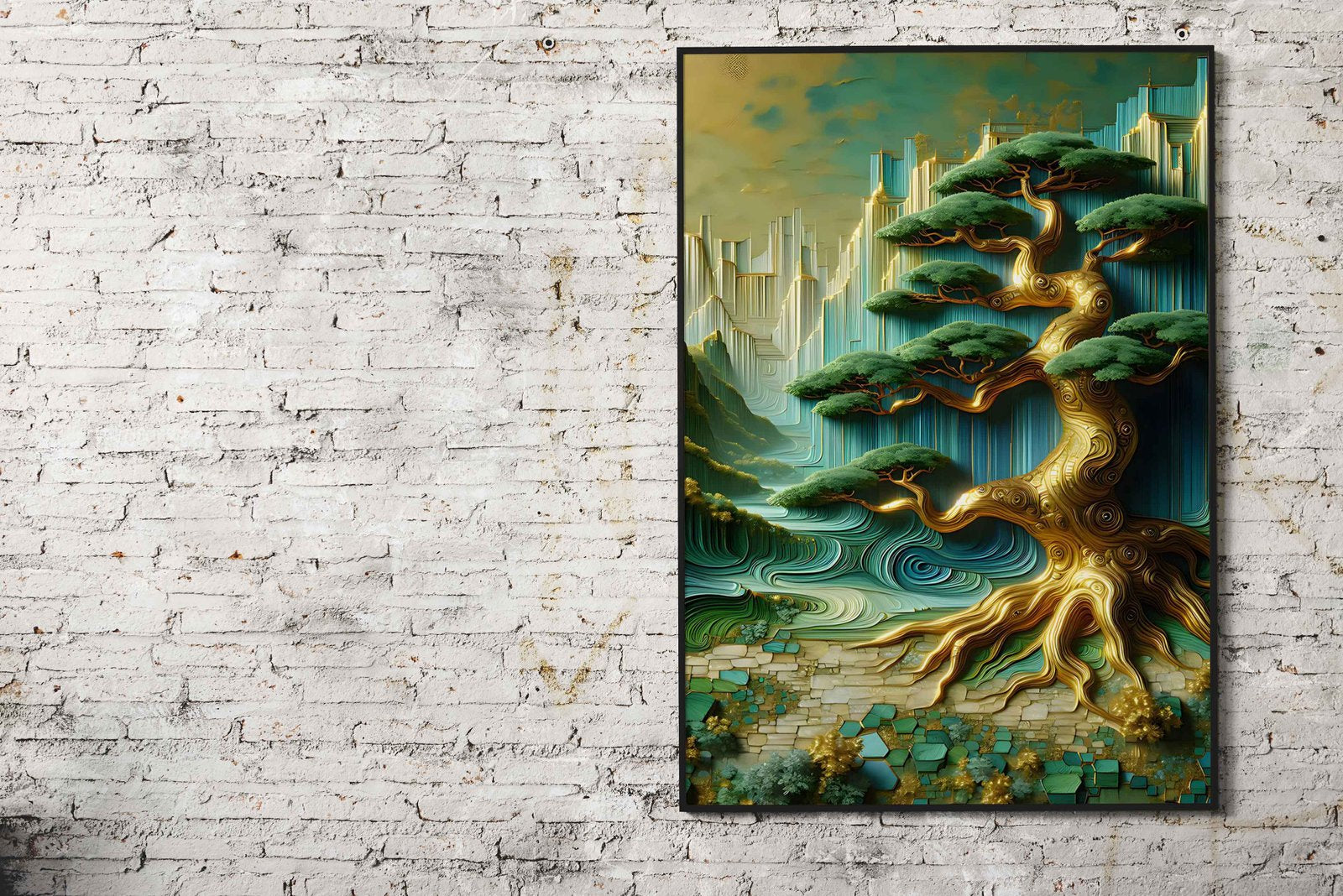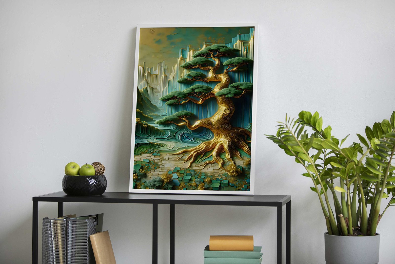 Golden Bonsai Tree Abstract Landscape Asian Style Poster | Wall Art for Home & Office | High-Quality Print