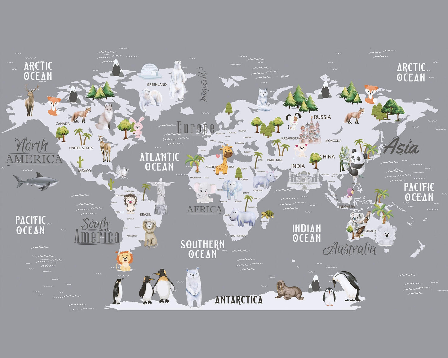 Gray World Map Wallpaper, Kids, Room, Wall Cover, Design, Nursery #12