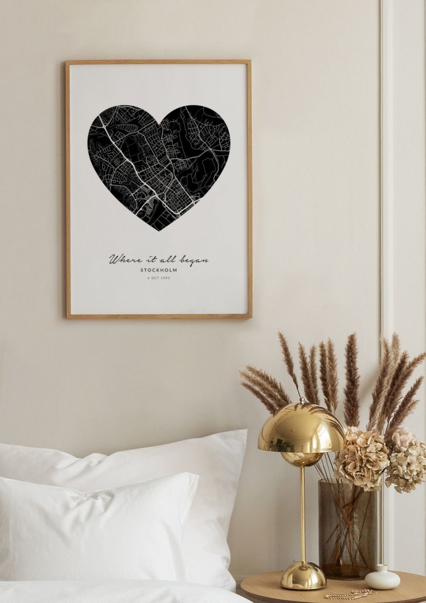A black and white map of any location that you choose, in the shape of a heart. Enter your date of choice to commemorate a special moment in place and time.