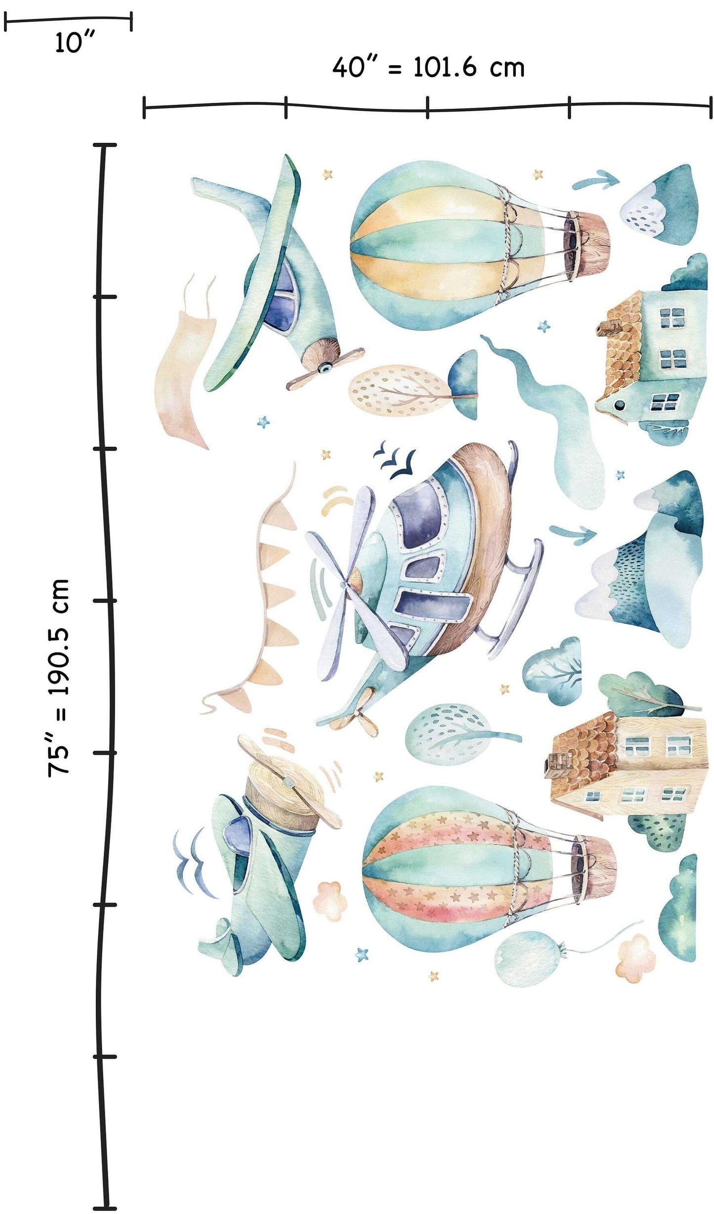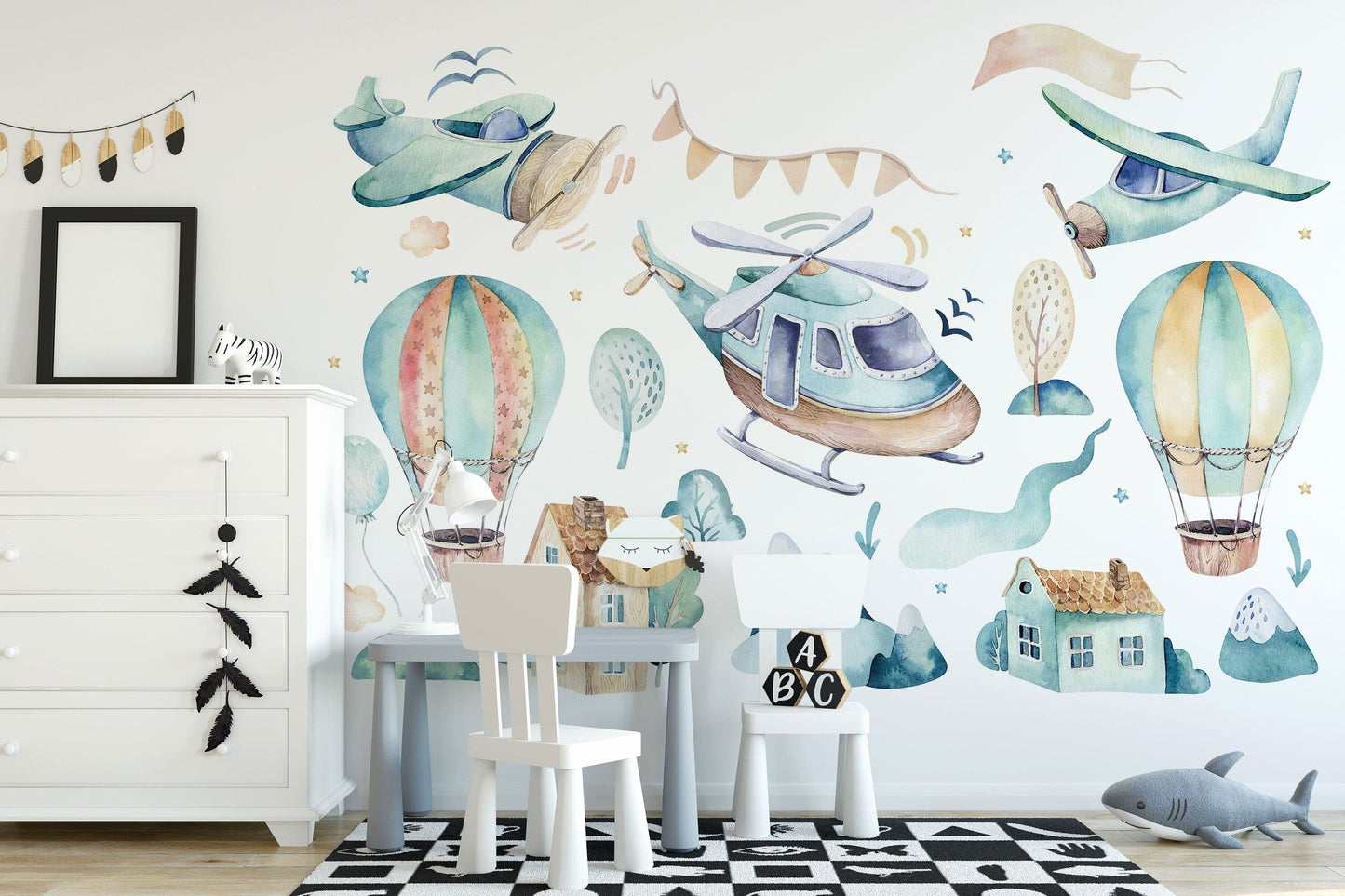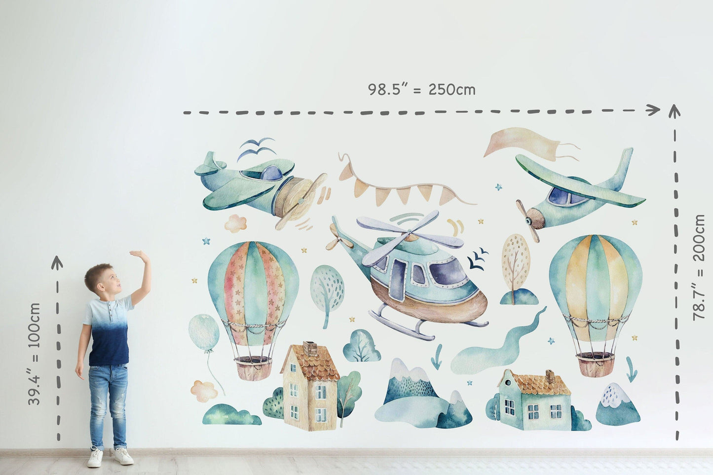 Hot air balloon Wall decal, Nursery wall decal, Watercolor Hot air balloon, Airplane wall sticker, Boys wall decal, Name wall decal