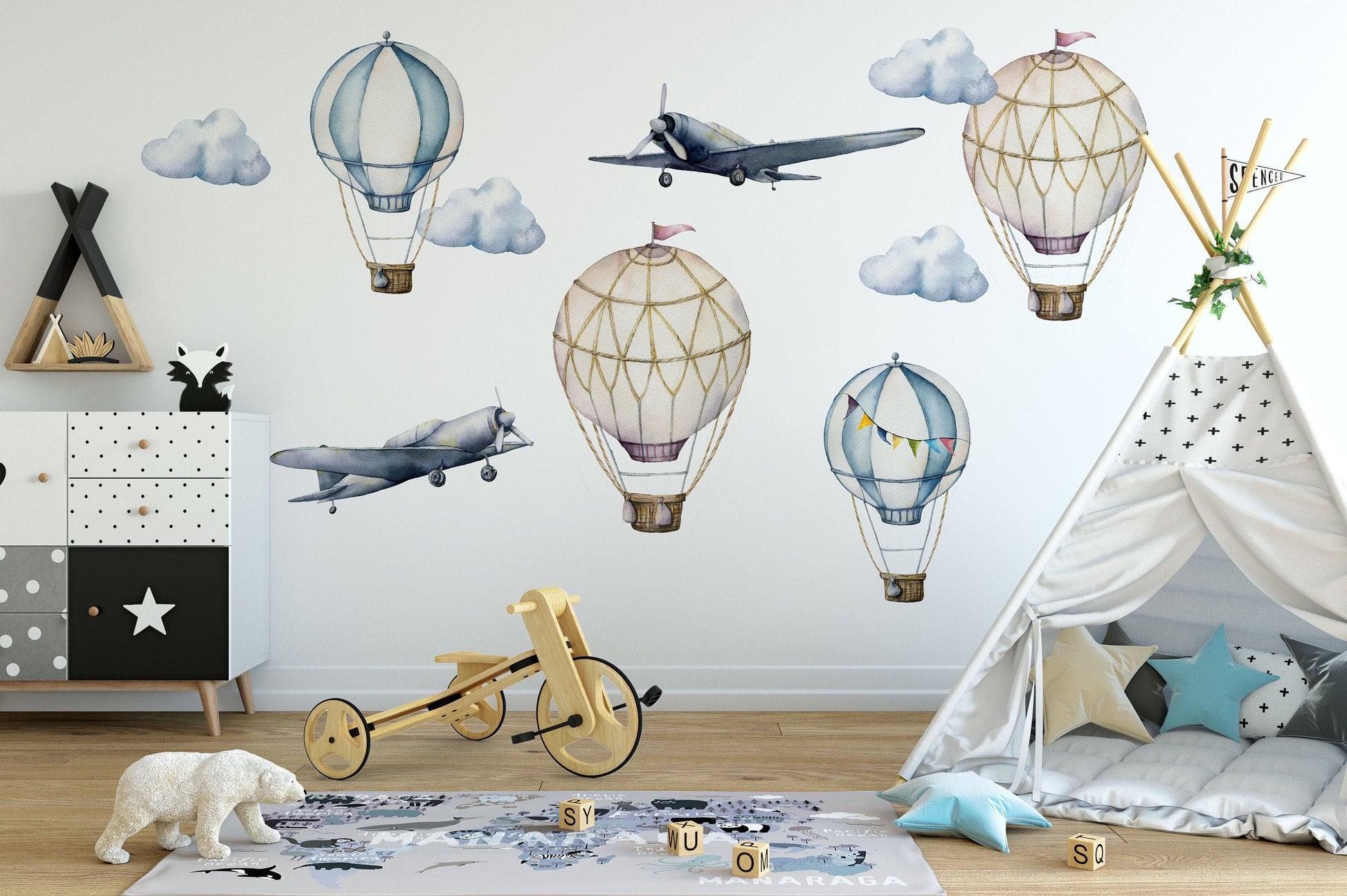 Selection of hot air balloon wall stickers from our Vintage range. This set is designed to transform the entire room or create a gorgeous feature wall.
