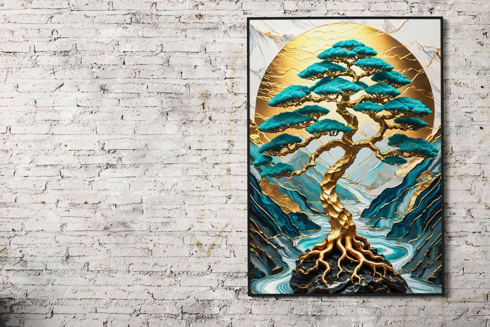 Japanese Art Landscape Golden Bonsai Tree Mountains Background and River flowing Asian Style Poster | Wall Art for Home & Office | High-Quality Print