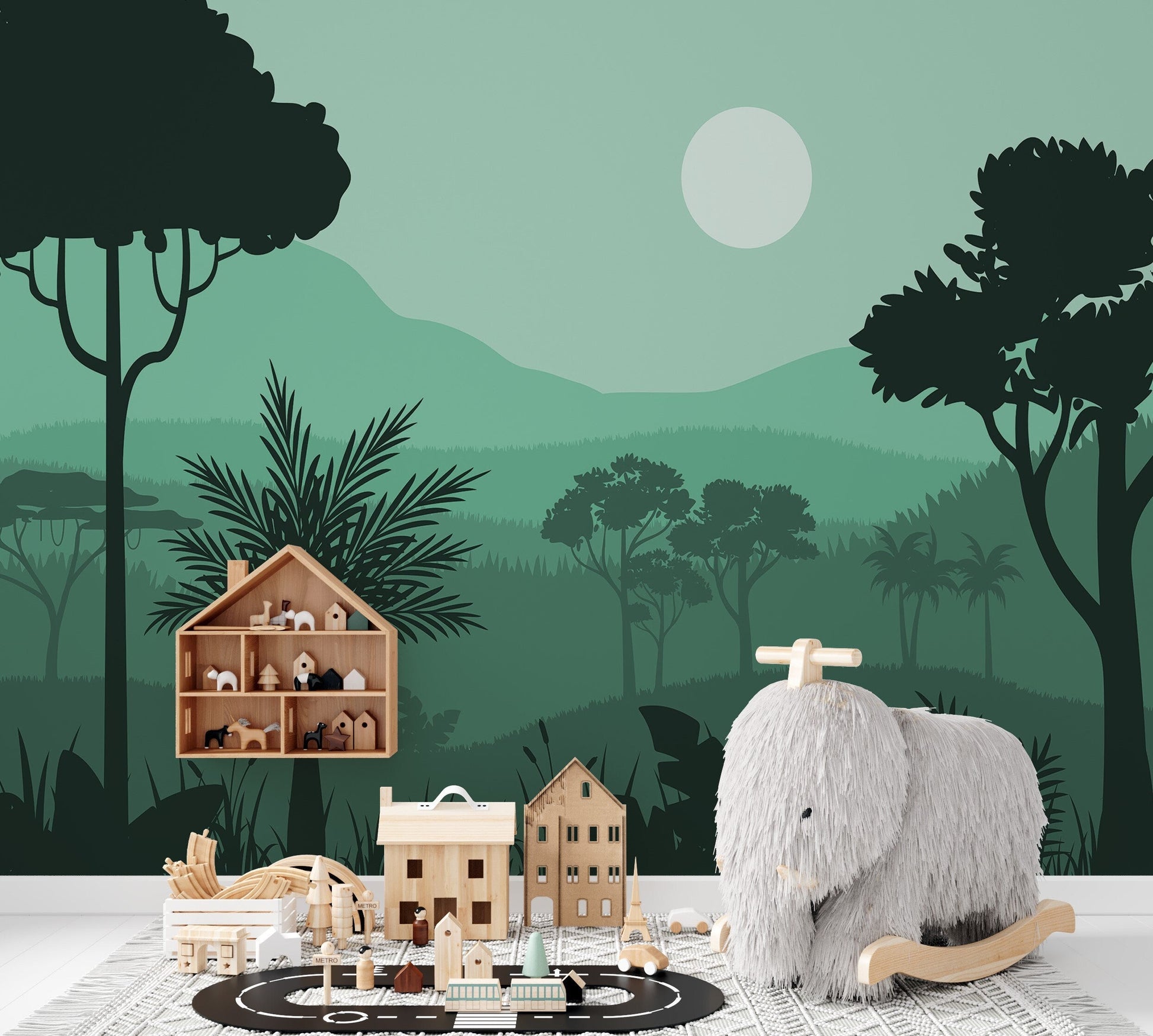 This wall mural features gorgeous watercolour jungle landscape. This wallpaper mural would be a fantastic background for any furniture in girl's, boy's or even bedroom!