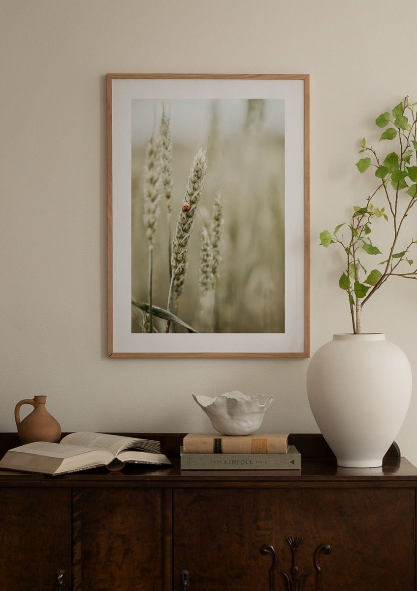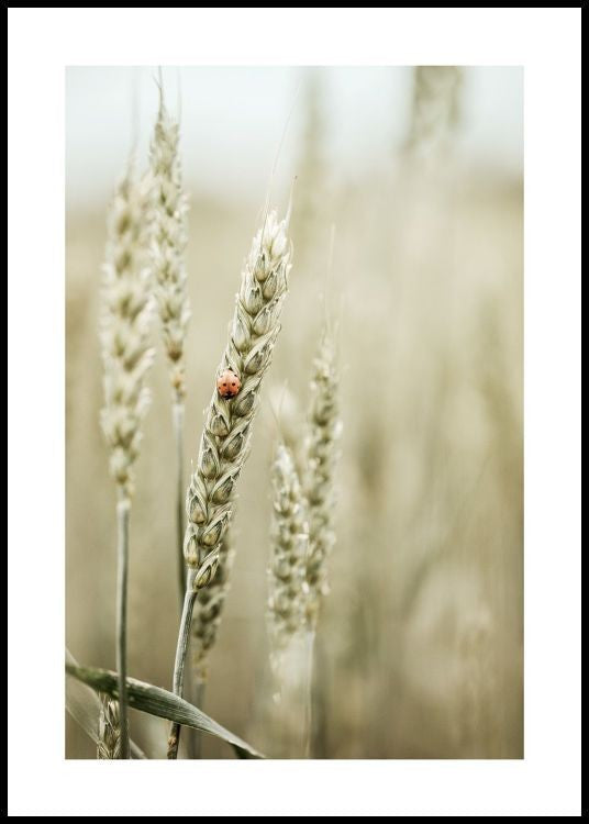 A beautiful close-up photo poster of a red ladybug on a wheat stalk in a field, with a soft green and beige blurry backdrop. This nature print makes a lovely addition to your home. This poster has a white margin around the image to frame the design. This is an exclusive poster, originally created by a photographer in our Art Studio.