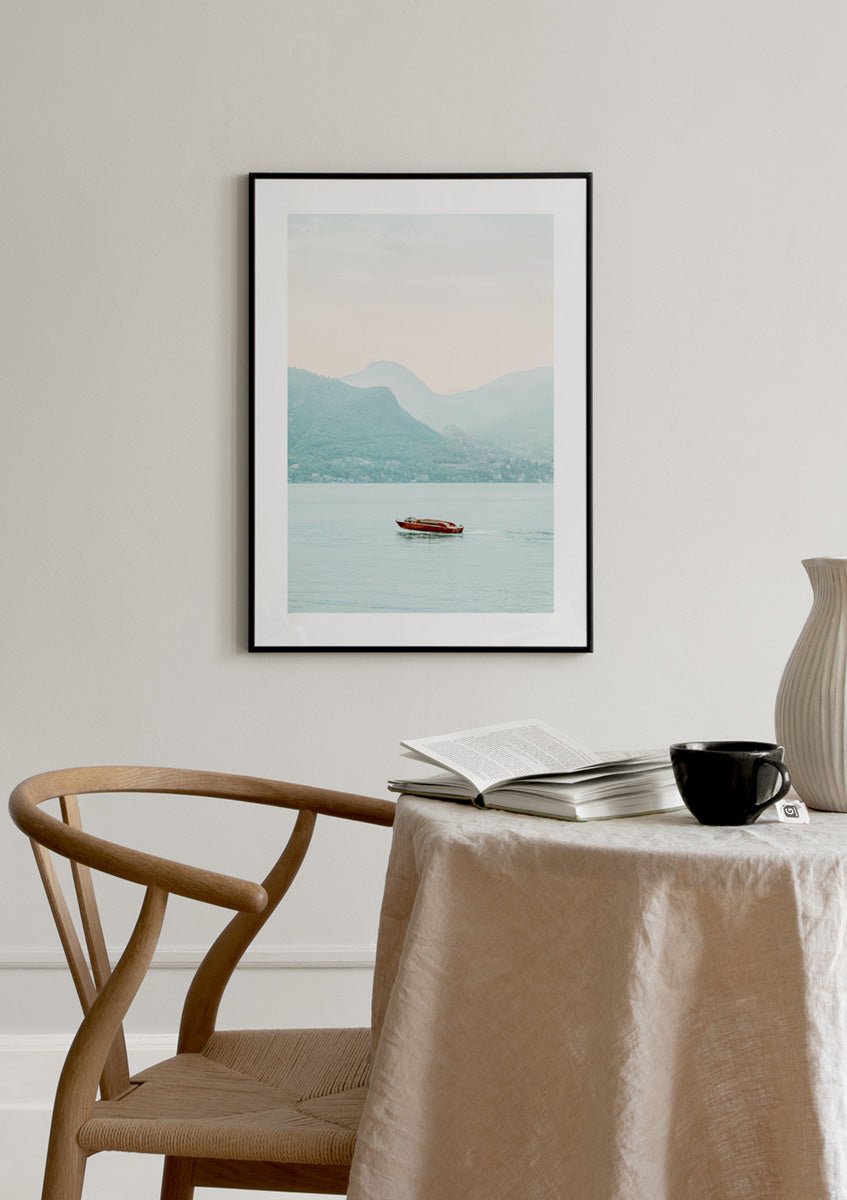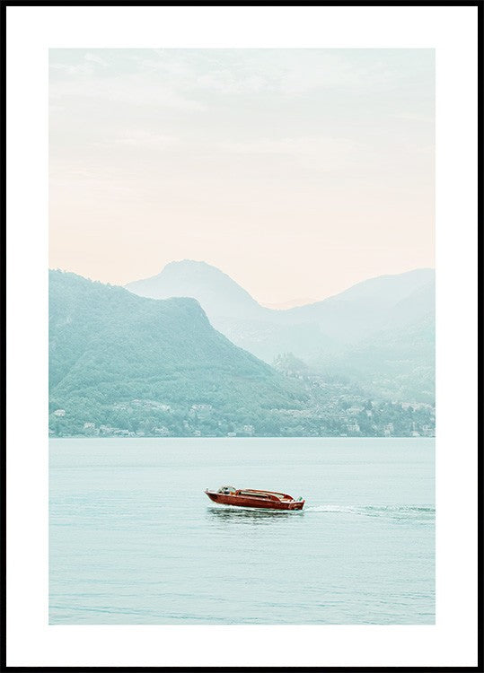 Photograph of a boat driving in Lake Como with beautiful mountains rising in the background while the sun sets. This print with soft modern colours will bring a peaceful feeling into your home. The poster has a printed white margin that frames the design.
