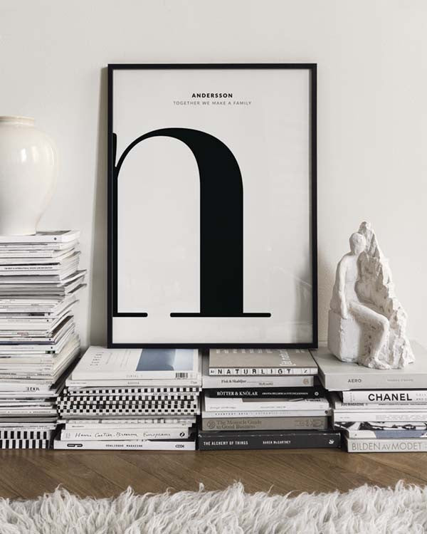Create a personal family poster with the letter "n". Personal poster with black text on a white background. Write your family''s last name together with a quote that represents your family. Please note that it is not possible to return a personalised poster