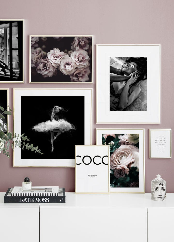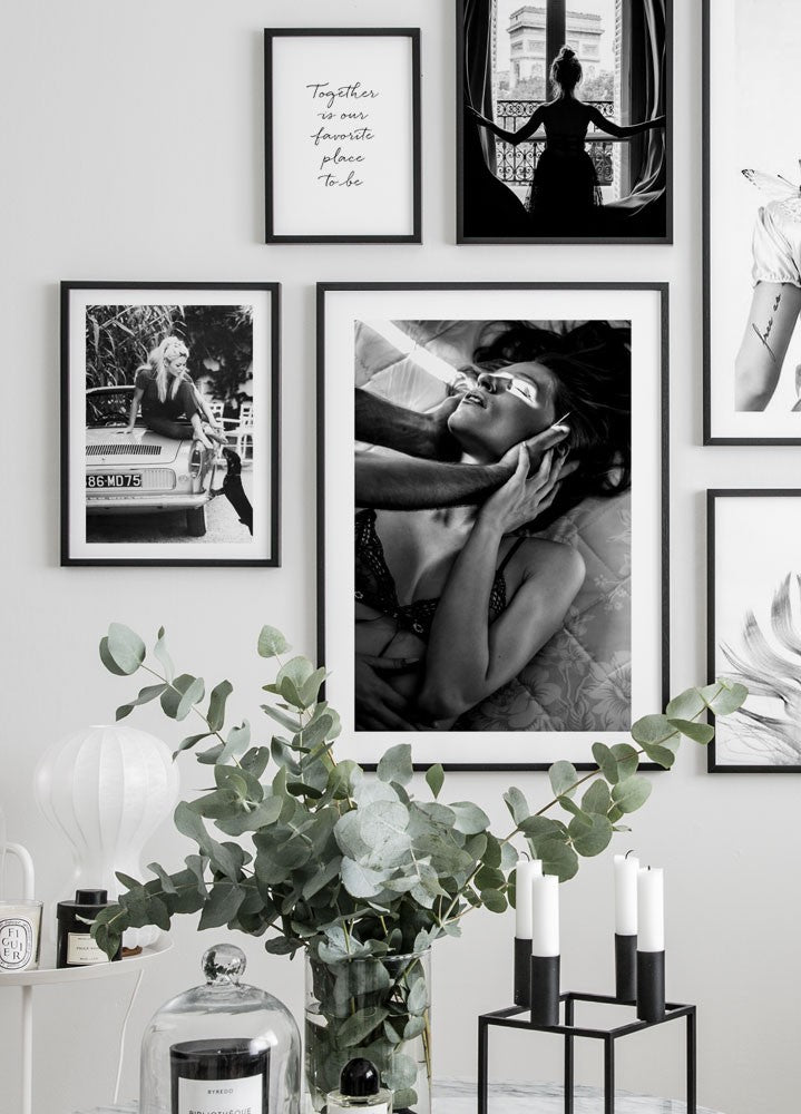 Black and white photo poster with a sensual motif of a dark-haired woman lying on a floor in underwear with a pair of hands around her face. The poster has a printed white margin that frames the design.