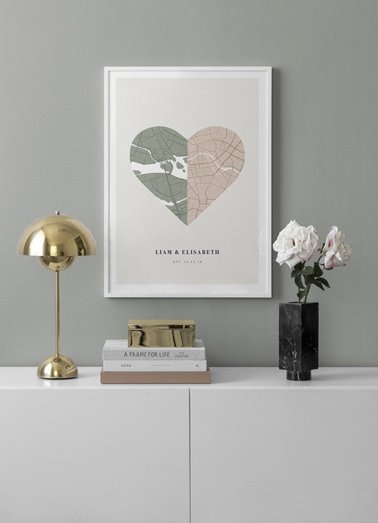 - Heart-shaped city map in green and pink on background in light grey with text at the bottom Green and pink city map in the shape of a heart on a light grey background with text at the bottom. Personalised prints allow you to customise your very own print, either by adding your own text, names or dates. It's both a fun way to personalise your own art or to give as a gift to someone else. The poster is printed with a white border. Printed to order. Please note that it is not possible to return a personalised poster.