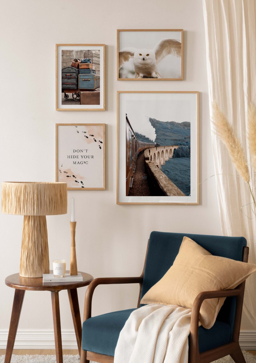 Follow the path to a magical land with photographs of an owl, trolley, and a steam train together with a quote print with the text "Don't hide your magic". A magical poster kit, perfect for the teenager's room. One or more prints have a printed white margin that frames the design. PS52194 Trunk Trolley Poster (30x40 cm) PS51163 Hedwig Poster (30x40 cm) PS52196 Don’t Hide Your Magic Poster (30x40 cm) PS52193 Express Train Poster (50x70 cm)