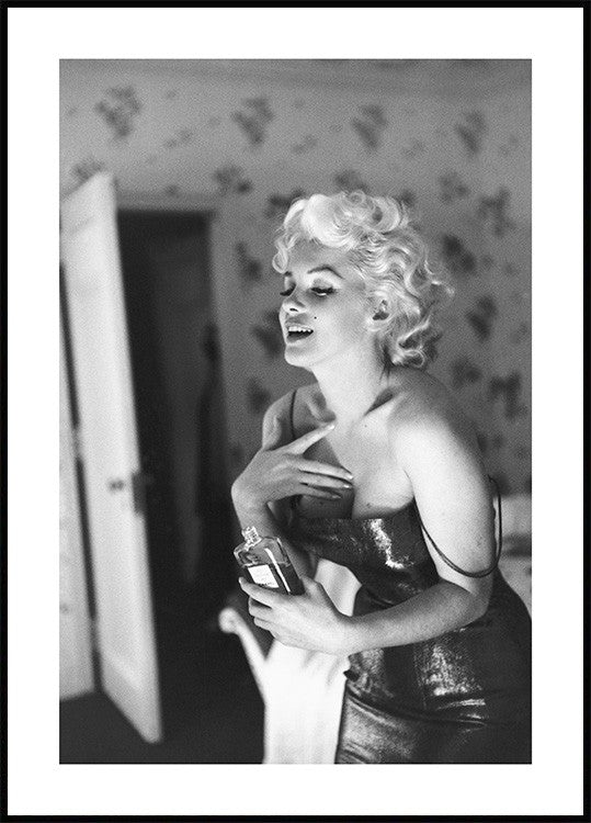 Iconic photo art poster in black and white with a motif of Hollywood-icon and model Marilyn Monroe. On the poster we see Marilyn holding her signature fragrance Chanel No. 5. The poster has a printed white margin that frames the design. Marilyn Monroe™ is a trademark of The Estate of Marilyn Monroe LLC. Rights of Publicity and Persona Rights are used with the permission of The Estate of Marilyn Monroe LLC