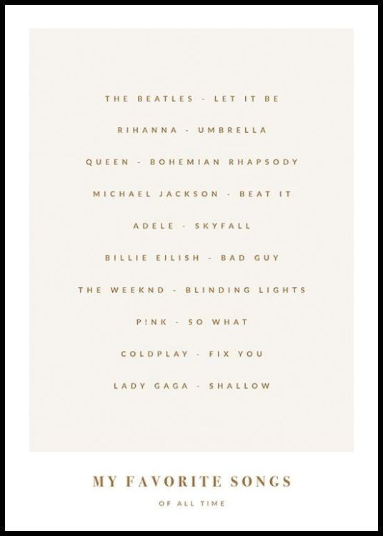 - List of songs in beige with text at the bottom Text print in beige with a list of songs and text at the bottom. Personalised prints allow you to customise your very own print, either by adding your own text, names or dates. It's both a fun way to personalise your own art or to give as a gift to someone else. The poster is printed with a white border. Printed to order. Please note that it is not possible to return a personalised poster.