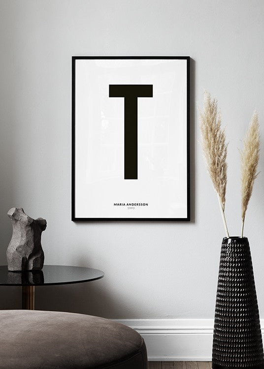 - A minimalistic text poster with the Letter T and smaller text underneath on a white background Text poster with the Letter T in black on a white background, with smaller black text to personalise underneath. Personalised prints allow you to customise your very own print, either by adding your own text, names or dates. Its a fun way to personalise your own art or to give as a gift to someone else. Printed to order. Please note that it is not possible to return a personalised poster.