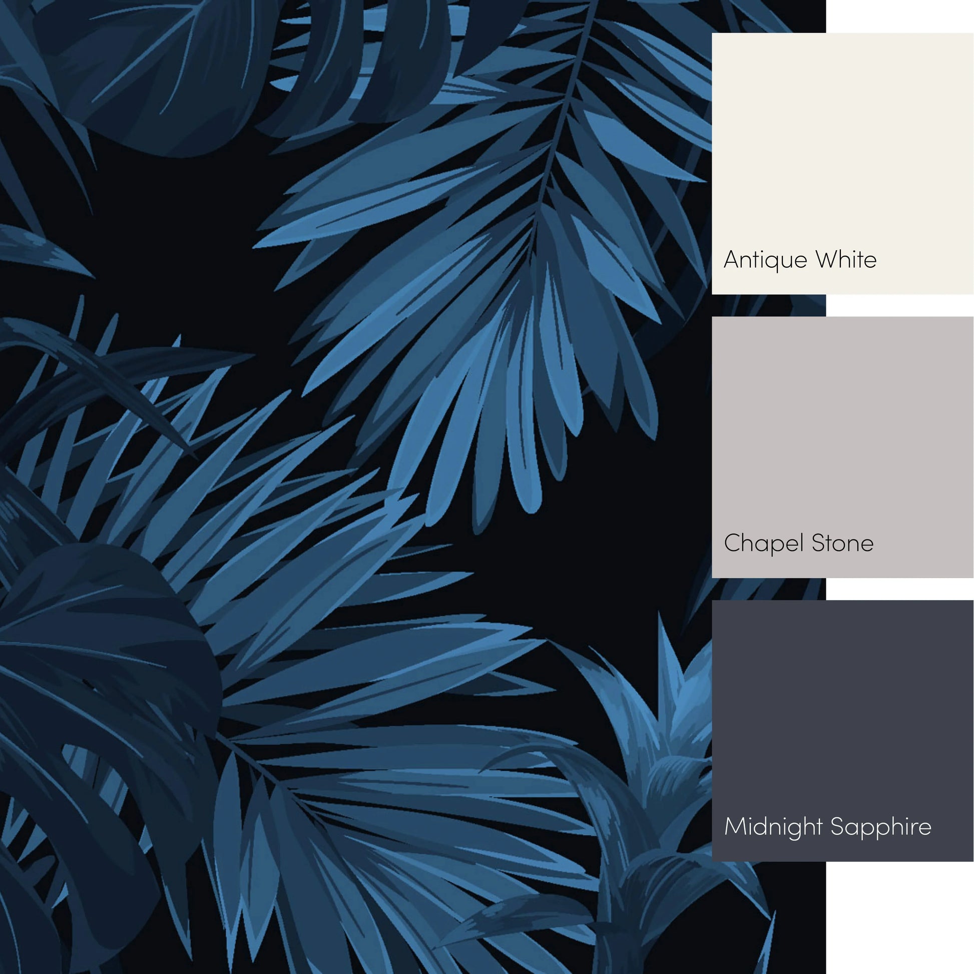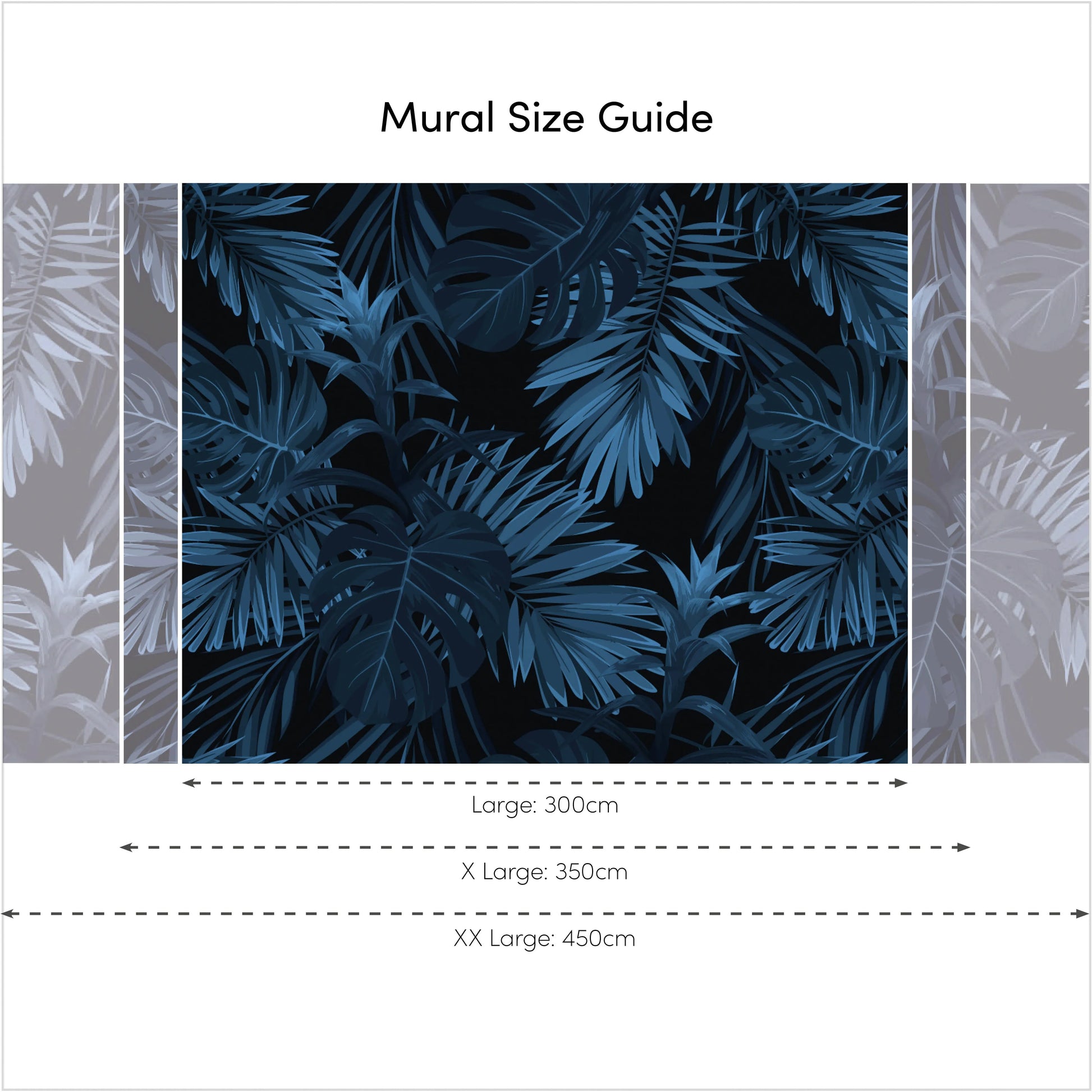 This mural has a dramatic tropical feel, featuring a vibrant colour scheme and a stunning, oversized navy leaf design. The overlapping effect creates a sense of depth, while the rich colours make it a striking addition to any feature wall. To enhance the beauty of this mural, complement it with dark, rich furnishings and a variety of dazzling foliage for a look you’ll absolutely love.