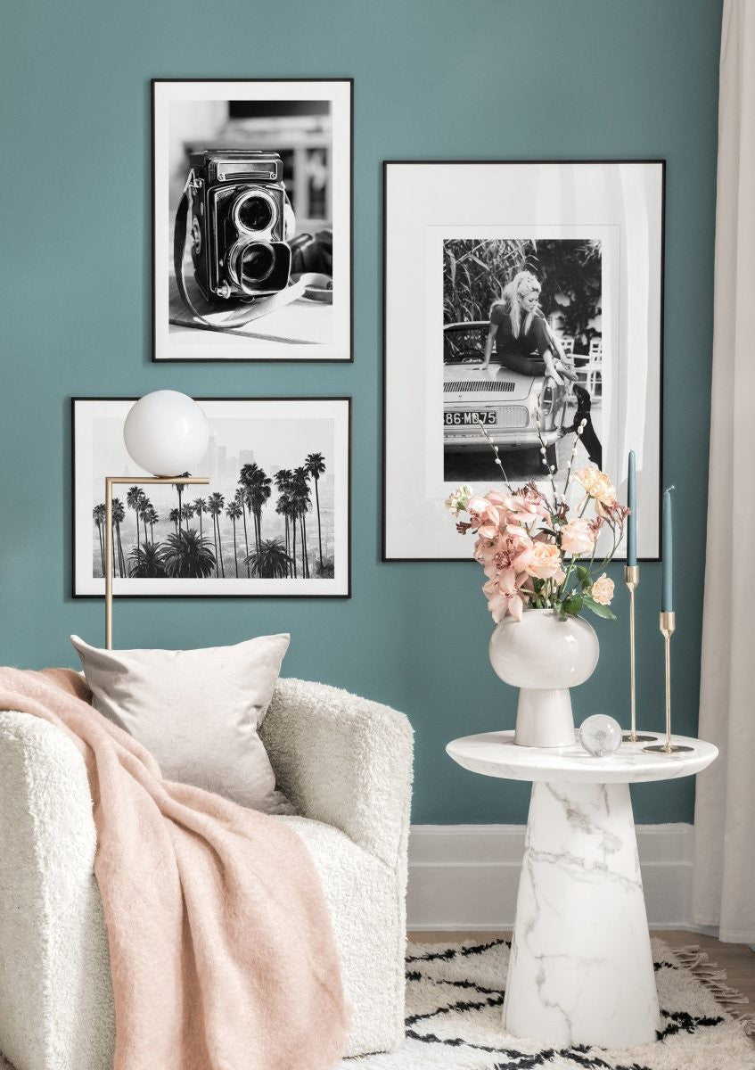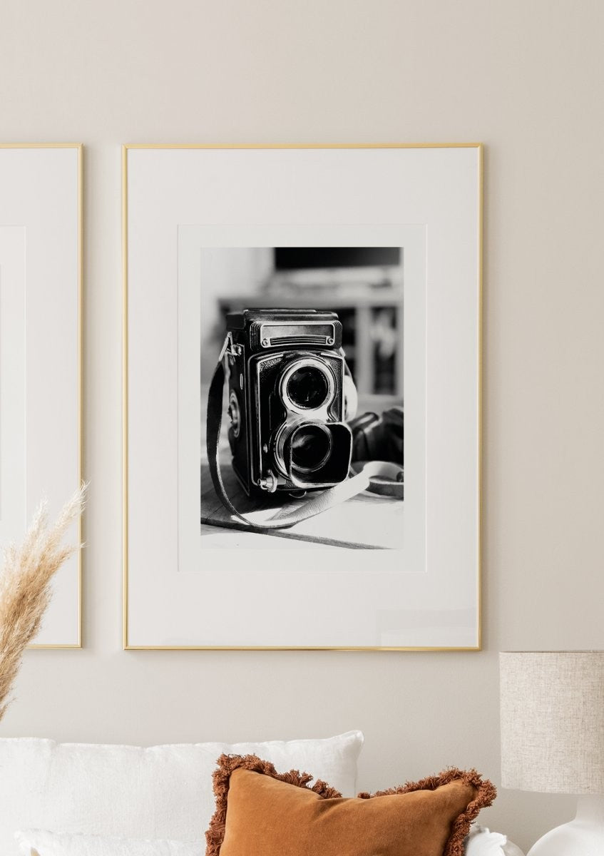 A stylish black and white retro poster of a vintage camera. This vintage poster is not only a great print for camera collectors but it also fits perfectly into every home and creates great retro feeling. The poster has a printed white margin that frames the design.