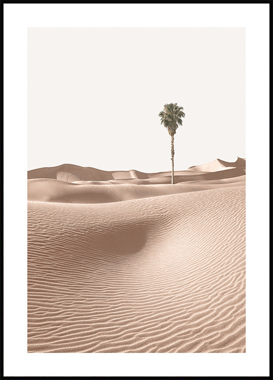 Photograph of sand dunes in beige and a palm. A tropical home decor makes your home feel like summer the whole year. The poster has a printed white margin that frames the design.