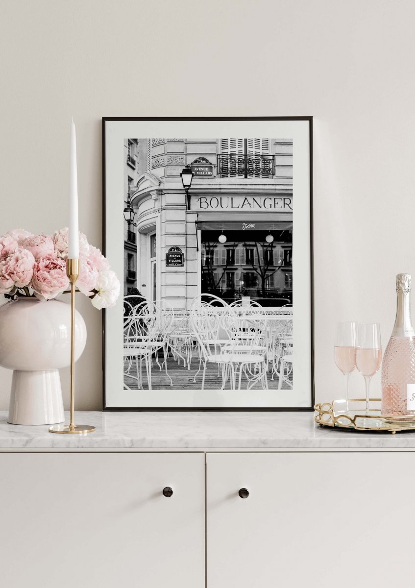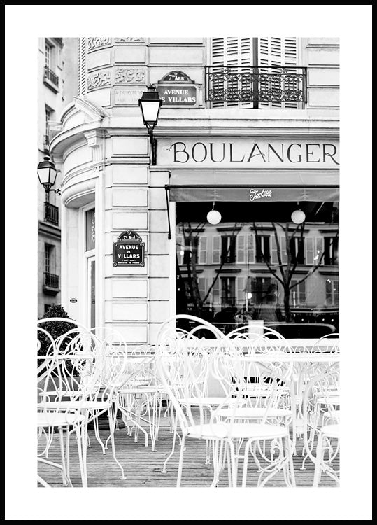 Black and white photograph of a petite boulangerie in Paris. Perfect pair with Paris Corner Poster. The poster has a printed white margin that frames the design.