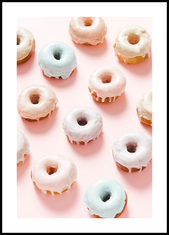 A pastel-coloured kitchen poster of colourful donuts on a pink background. If you love donuts as much as Homer Simpson, this photo poster is the perfect poster for your kitchen. Bring soft pastel colours into your kitchen for a fresh look. The poster has a printed white margin that frames the design.