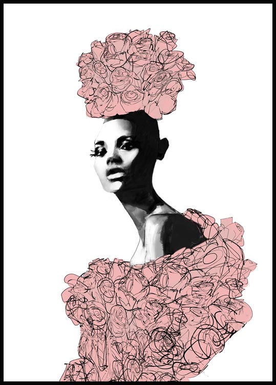 Trendy and stylish black and white poster of a woman, coverd in a bouquet of pink roses. The roses have been placed perfectly on top of her head as well as around her body. They create an illusion of the woman wearing a trendy hat and jacket. The pink combined with the black and white woman, in front of a white background, creates a stunning stylish composition. This print belongs to the Peytil collection, created for an art project by Eitil Thorén in Stockholm, Sweden in 2016. With its minimalistic black lines and graffiti-style spontaneity the collection has a modern touch to it clearly influenced by Scandinavian design. All prints are expressive as well as personal. The name of the collection originates from Eitil Thorén's childhood as his mother nicknamed him 'Peytil'. Artist: Peytil