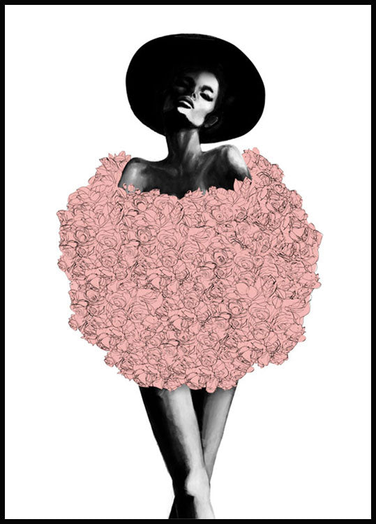 Fashionable and stylish black and white poster of a woman wearing a black hat and a short dress made of light pink roses. She has her head slightly tilted back whilst steadily gazing at the viewer, making her seem somewhat conceited. The chalk white background beautifully contrasts with the image. This print belongs to the Peytil collection, created for an art project by Eitil Thorén in Stockholm, Sweden in 2016. With its minimalistic black lines and graffiti-style spontaneity the collection has a modern touch to it clearly influenced by Scandinavian design. All prints are expressive as well as personal. The name of the collection originates from Eitil Thorén's childhood as his mother nicknamed him 'Peytil'. Artist: Peytil