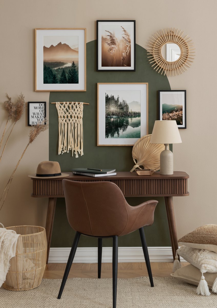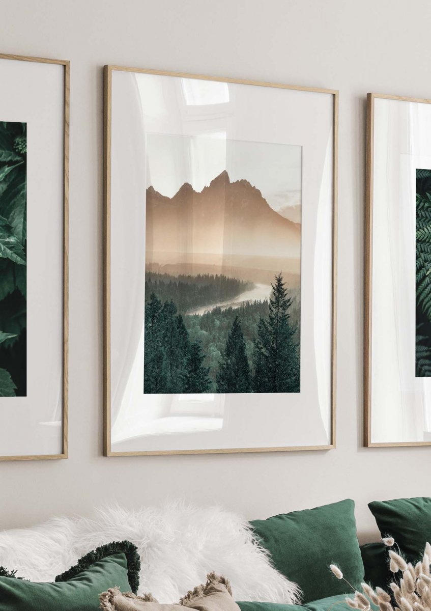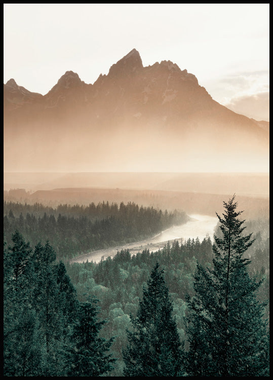 Photograph of a beautiful pine tree valley. You can see a small river through the trees, with big mountains in the background. This poster will be a great match in the bedroom because nature prints always embrace calmness and inner peace.