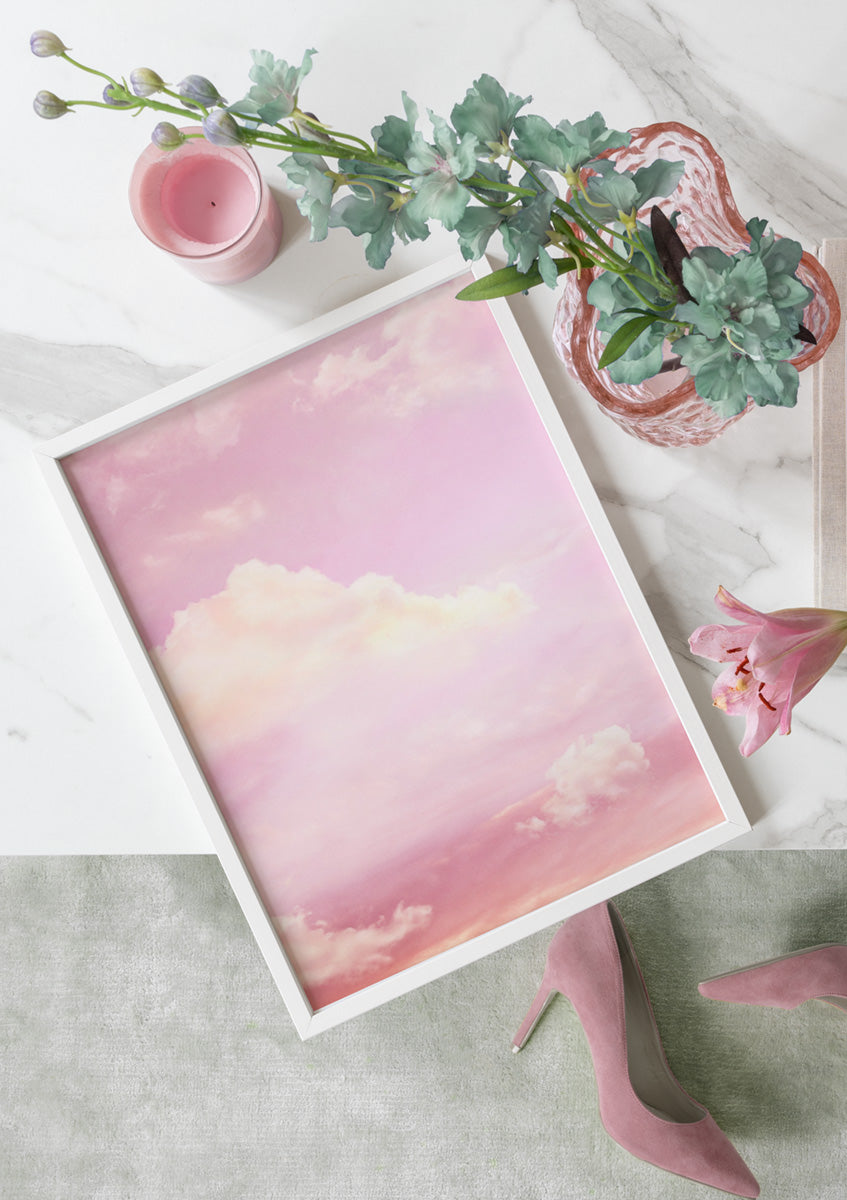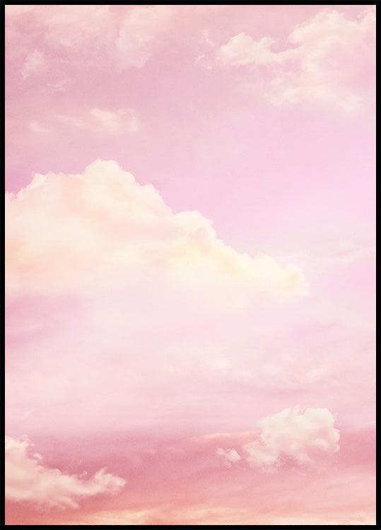 Photograph of white sheer clouds rising on a pink-shaded sky. A cute and soft motive that is easy to combine with other posters to create a gallery wall. This art print has a grainy photo structure.