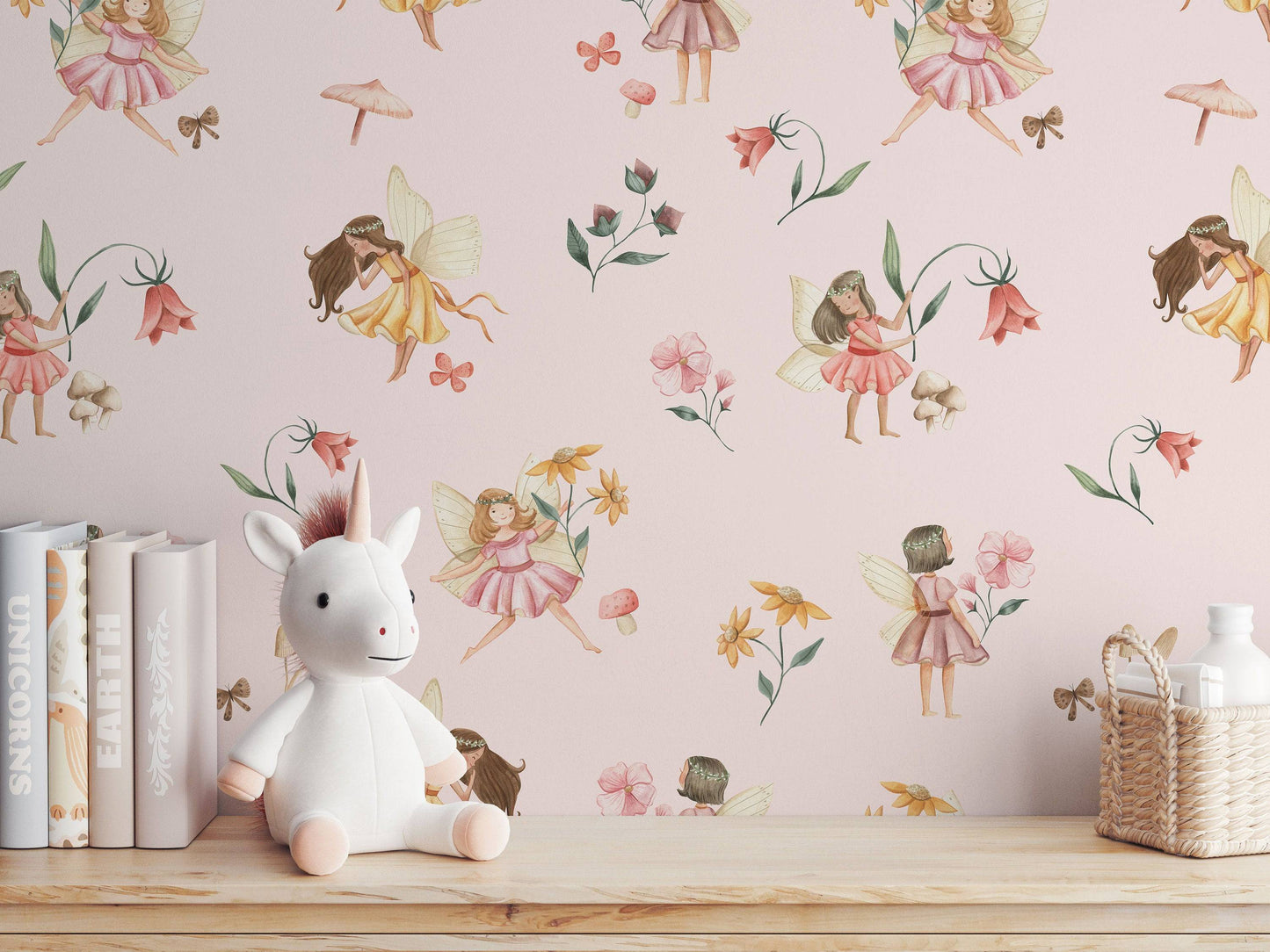 Pink Fairy Removable Wallpaper | Watercolor Fairies Wall Decor | Nursery Fairytale Mural
