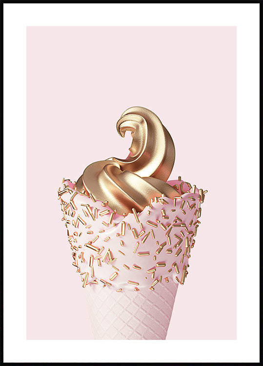 Wall art of golden ice cream and sparkles with a pink cone and background. This print really makes you crave ice cream. This poster is perfect for the playful person who loves fun colours on the walls or the teenagers room. The poster has a printed white margin that frames the design.