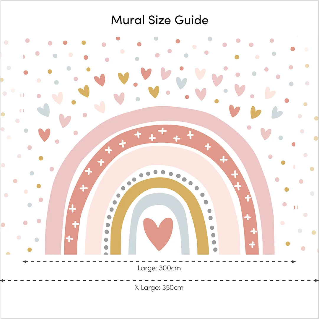 The white space surrounding the rainbow is adorned with playful polka dots and hearts, adding a delightful touch of fun. Each dot and heart complements the colors of the rainbow, creating a harmonious scene that fills the room with joy. Whether you're decorating a nursery, a playroom, or your little one's bedroom, this mural is sure to be a show-stopper, instantly transforming the space into a magical wonderland.