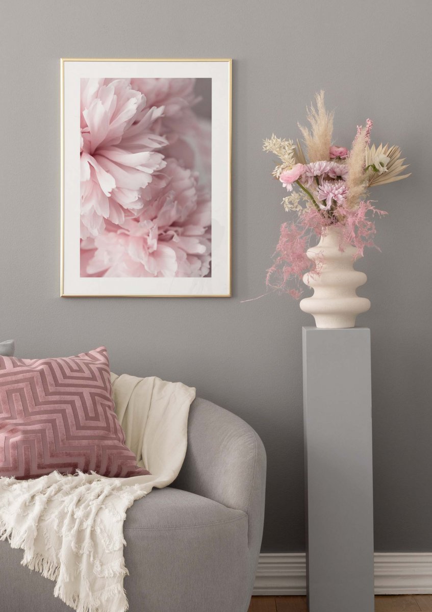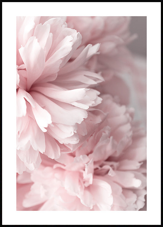 Photograph of pink peonies in close-up. Botanical and flower wall art creates a warm and welcoming feel in your home. Combine this poster with your favourite quote print! The poster has a printed white margin that frames the design.