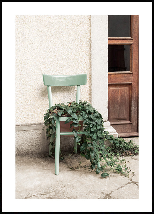 Photograph in calm colours. Featuring a chair with a green plant against a beige house wall. Create a welcoming feel in your home interior with this wall art. Perfect wall art to add in the hallway or living room. The poster has a printed white margin that frames the design.