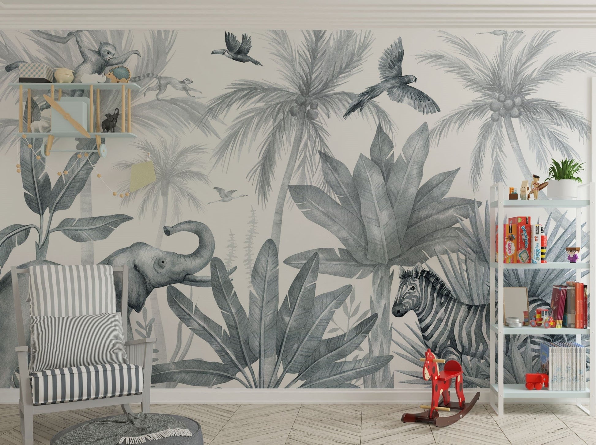Monochrome Safari wallpaper featuring safari animals and the beautiful landscape, it is the perfect addition to a nursery, girl's, boy's room or a bedroom. Soft grey shades would be a fantastic base for any furniture in the room and would create a lovely feature wall!