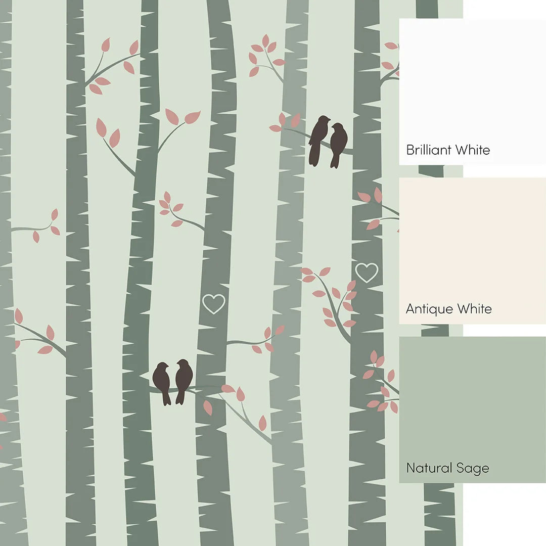 Transform your living space into a serene forest oasis with our enchanting love birds mural. The design features narrow green tree trunks that rise majestically against a soft pastel green backdrop, creating a tranquil atmosphere perfect for relaxation.