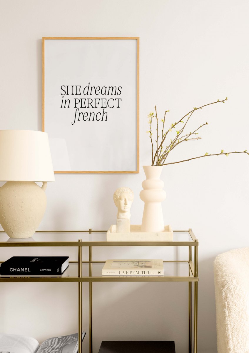 Quote print with the text She dreams in perfect French with black text on a white background. A chic and simple poster with a touch of fashion. Text prints are a great foundation for your gallery wall.